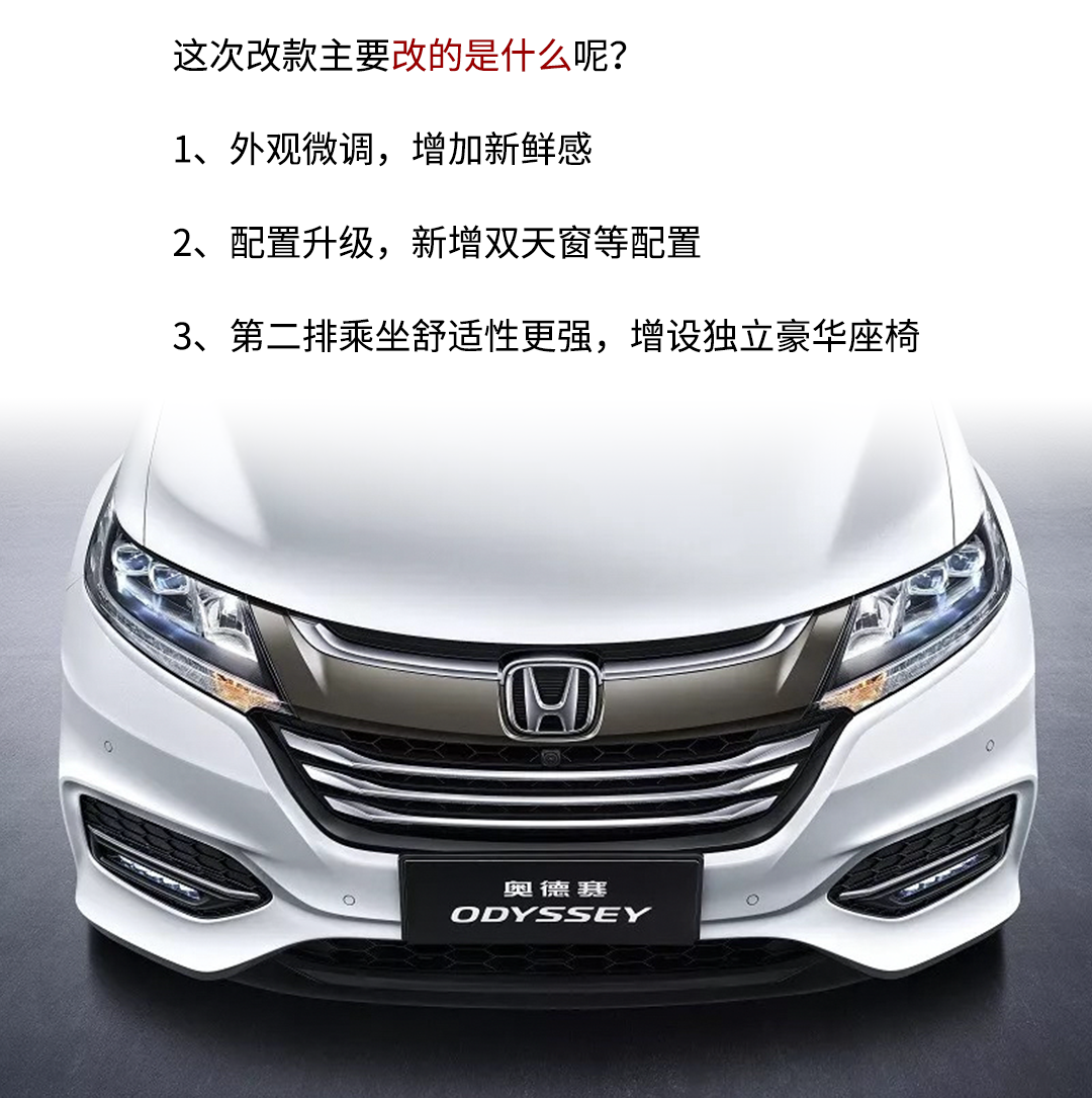 结语:第五代奥德赛从2014年至今,经历了约4年时光,产品本身的确有点跟不上时代的步伐。而这次的中期改款车型无论是在设计上还是配置方面都有了一定的提升,无疑是进一步提升了它的产品力,有助于奥德赛未来的销量表现。但是教授其实更希望能在新款车型上得到关于隔音问题的改善消息。是否如官方所说的那样静音也有一定的提升呢?等教授明天试驾完告诉大家。