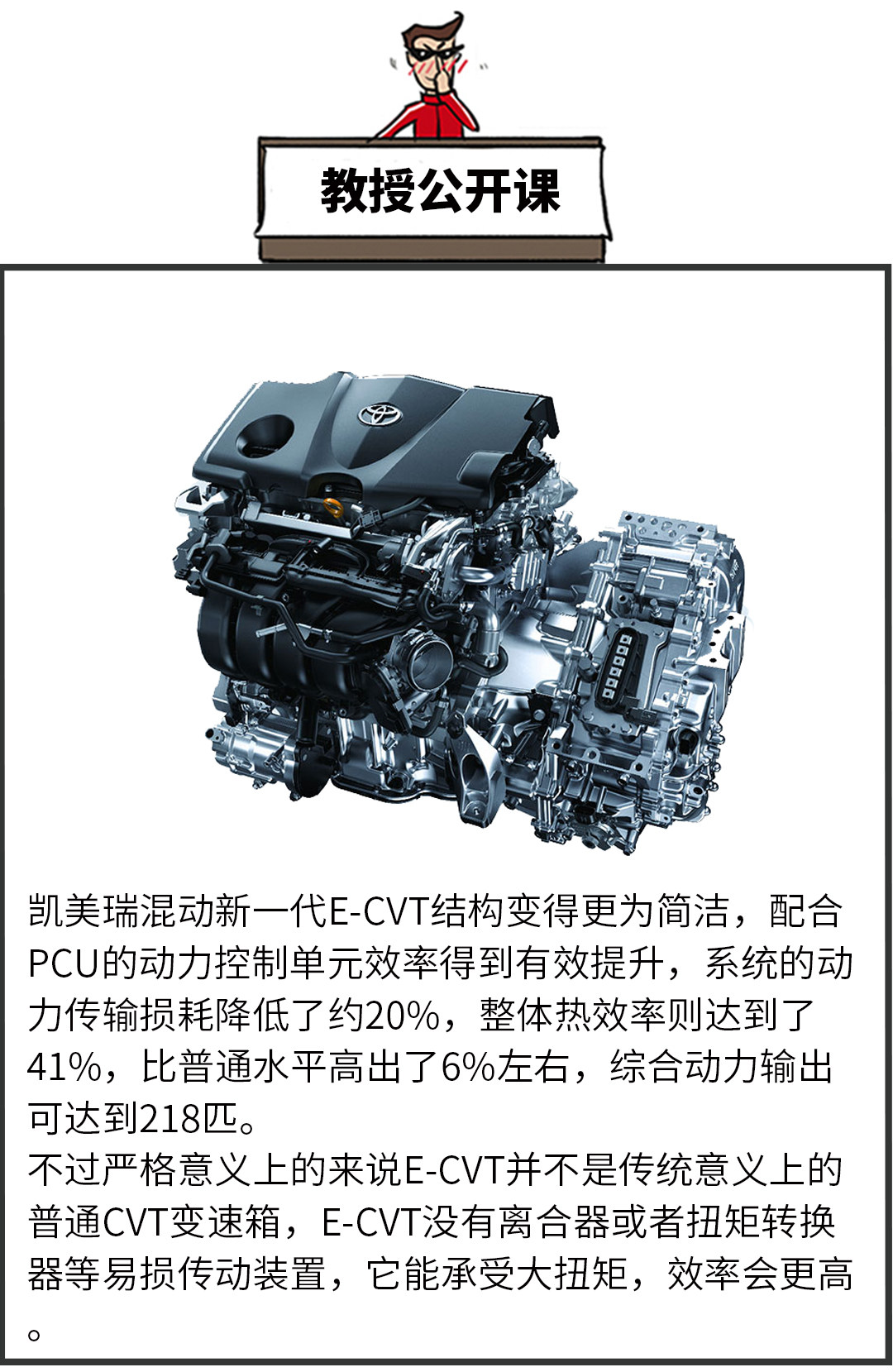 丰田车也是使用CVT变速箱比较多的车型,只不过现款凯美瑞只有混动版车型搭载了E-CVT变速箱,整体的来说,混动版凯美瑞的机械传递效率和燃油经济性都还比较令人满意,在实际的驾驶过程中,动力输出稳定,换挡平顺性也不错,而模拟的6挡设置则为驾驶者提供了更多驾驶感受体验。教授觉得,虽然凯美瑞CVT变速箱相对日产和本田使用得比较少,但从体验和技术水准来说,丰田的CVT变速箱技术还是很靠谱的。
