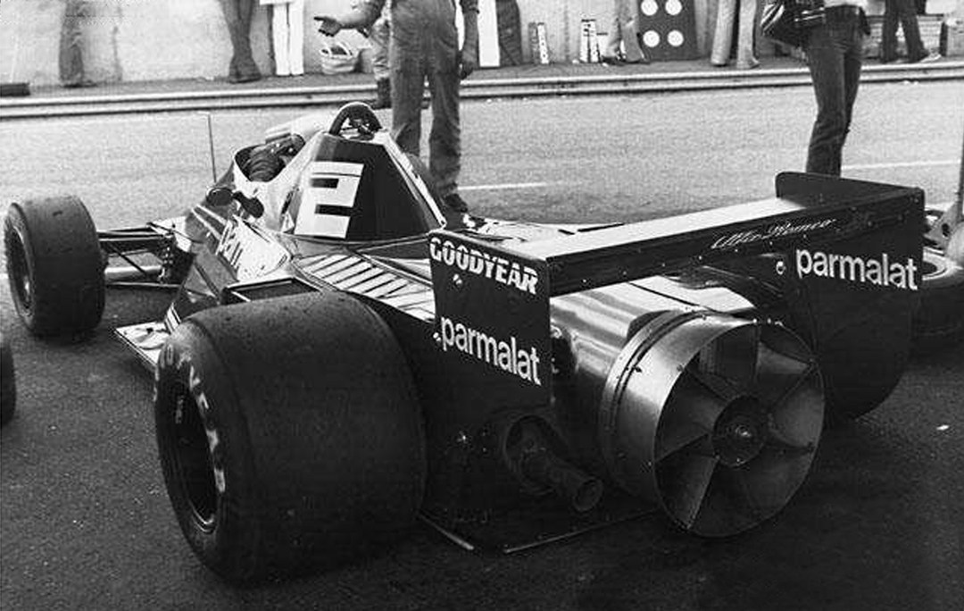 70年代末莲花地面效应赛车的成功让很多车队都对“地面效应”这项技术虎视眈眈,而其中1978年布拉汉姆BT46B就通过“大风扇”把车底的空气像吸尘器一样抽走,发动机转速越高,风扇的作用就越明显,从而使赛车底部形成接近真空的效果,把赛车紧紧地吸在路面上,大大提高过弯速度,同时它还能起到辅助发动机散热的效果,让它成为当时最强的赛车之一。虽然可动空气动力学装置是被大会禁止的,但设计师戈登·穆雷以“这个风扇是散热器”的理由把大会忽悠过去了。 不过到最后,还是因为布拉汉姆BT46B技术过于领先,以免其它车队的争议,国际汽联随后将这款赛车的风扇装置视作“可移动空气动力装置”,对它施行了永久性禁令。