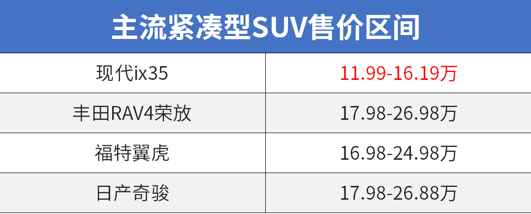 由于有了途胜的存在,新款ix35的定位发生了一些改变,用更低的价格来打入门紧凑型SUV市场成了新ix35的使命,这也使得ix35的价格直线走低,11.99万的起售价直接杀入了小型SUV的主力区间;相比较小型SUV来说ix35性价比显然高很多,更大的空间和更强的动力都是ix35的优势所在,最重要的是这车的口碑和尺寸都依然是CR-V级别的哦~