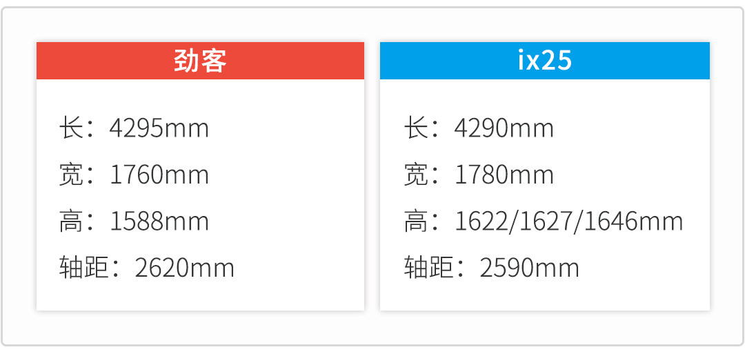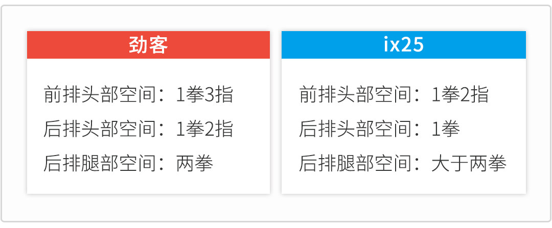 尺寸方面,两车长度几乎一样,宽度和高度ix25大一点,轴距则劲客长一点。但由身高都是170cm的试车员所测量出来的数据可以看出,两车的乘坐空间表现并不像车身尺寸那样,劲客的前后排头部空间更大,但轴距更长,反而腿部空间不如ix25。(数据仅供参考,不排除有误差),实际两车的乘坐空间都能满足一般3-4人家庭的用车需求,但行李箱就稍微小点。