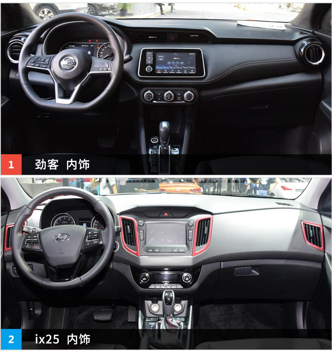 而ix25的内饰设计则没有太多亮点,整体设计可以看出是想营造一些运动感,比如红色的空调出风口装饰,和红色的缝线点缀,但实际出来的效果其中真的有点掉档了,实用性方面,或人体工学方面,虽然做得也跟劲客差不多,但实际视觉效果或氛围实在是与劲客有比较大的差距,你认为呢?