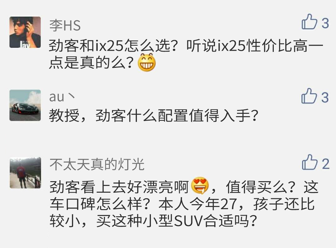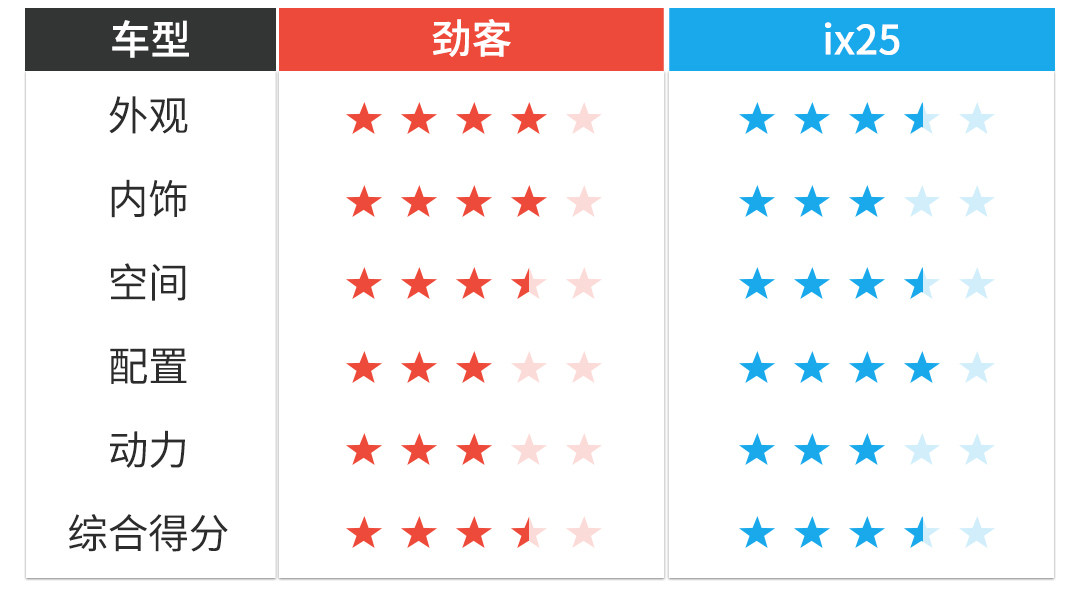 外观内饰方面,我个人认为劲客会做得更好一点,空间和动力两车都打成平手,配置方面ix25要更丰富,但再考虑到安全性,我会义无反顾站到劲客这边,如果是你,会怎么选择呢?