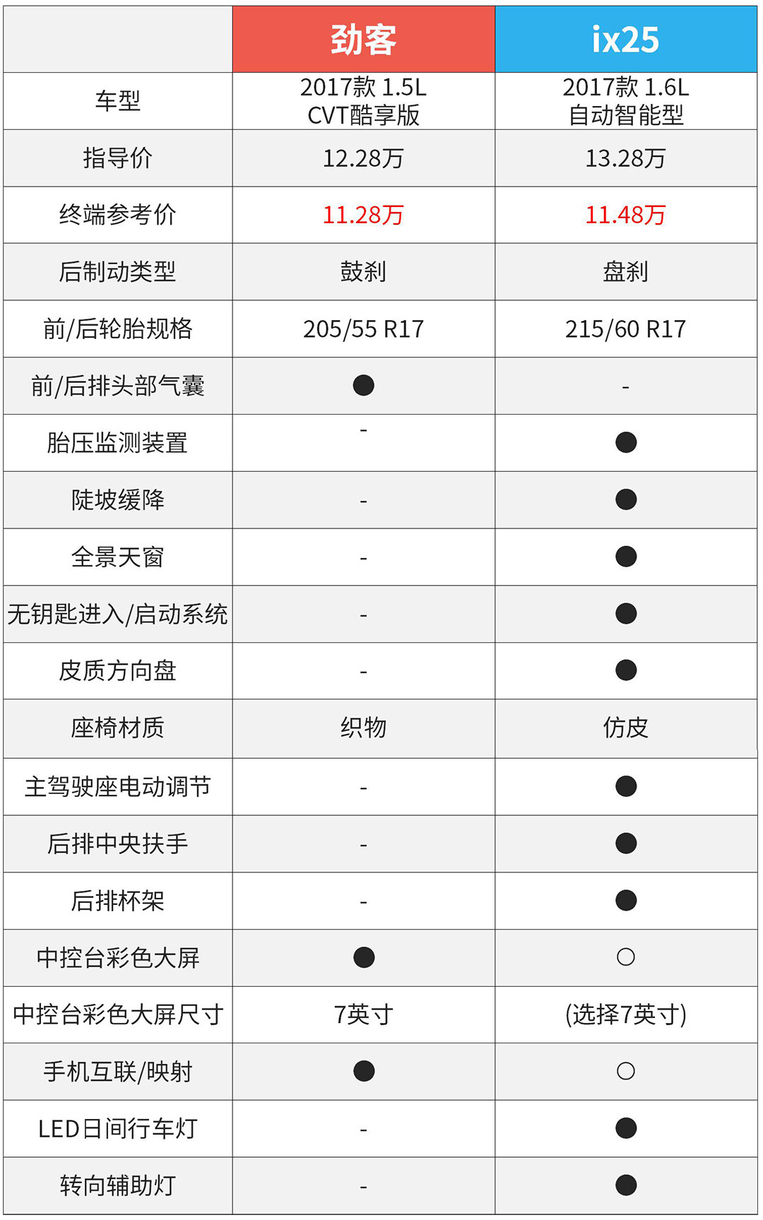配置方面可能是大家现在比较感兴趣的吧,我们通过选取两款对标动力,终端售价接近的车型做对比,从表格上可以明显看出,ix25的配置会更丰富,主要是胎压监测装置,徒坡缓降,无钥匙进入/启动系统这些实用配置上,还有就是全景天窗对于一部分消费者来说还是很吸引的。