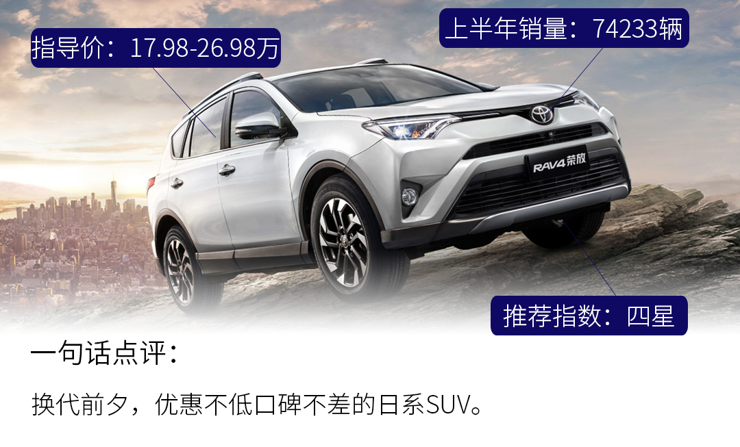 购买建议:就想要一款没什么性格、表现中庸、可靠舒适、驾驶没压力的家用SUV?那不如在RAV4荣放换代前来一波抄底吧。要选哪个版本?20万出头的中高配车型,加上目前2万左右的优惠,这是比较明智的选择。