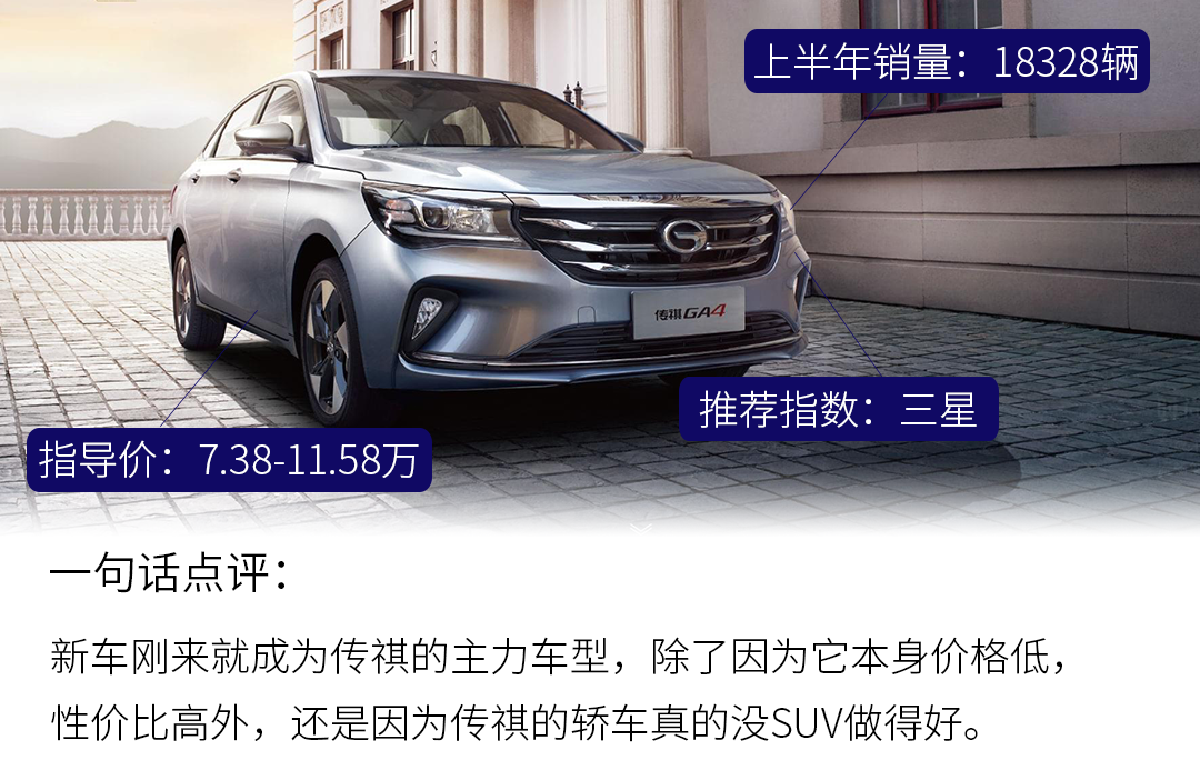 购买建议:对于广汽传祺,传祺GA4是一款相对出色的车型;但对于目前该级别的轿车市场来说,传祺GA4只是一个很常规的产品。这是教授对传祺GA4的看法。并没有多出色的市场表现、比较普通的产品力,传祺GA4相较于其他国产轿车、主流合资轿车,拿不出多令人惊艳的亮点。所以,其实在目前那么多拥有鲜明特性的轿车面前,消费者大可以选择更优质的或者更成熟的车型。