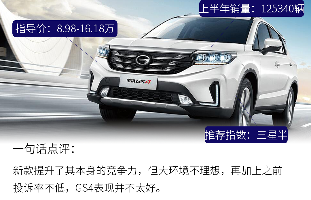 购买建议:质量问题频发、投诉不断的传祺GS4,就算中期改款时官降了1万元也挡不住它的销量疲态。越来越多消费者不考虑传祺GS4的情况下,你会因为颜值不低、性价比更高而选择它吗?嗯,教授这就不做一个购买推荐了。(深沉脸.jpg)