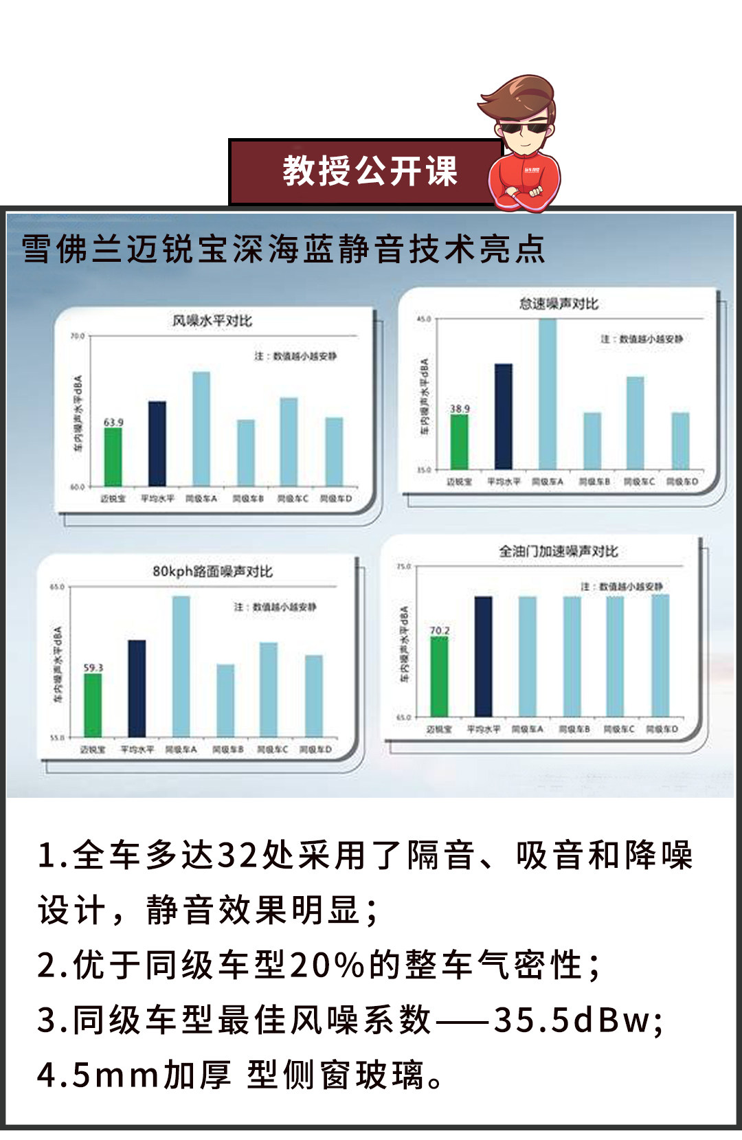 另外,迈锐宝对整个车身多处也进行了隔音材料覆盖,包括在车身前包围和地板处使用优化阻尼胶涂层,前后门使用密封性更好的密封条,车门内侧覆盖高吸音性能复合材料,车身内部植入了加厚隔音棉等等,整个车身的静音材料覆盖高达90%,静音效果显著。