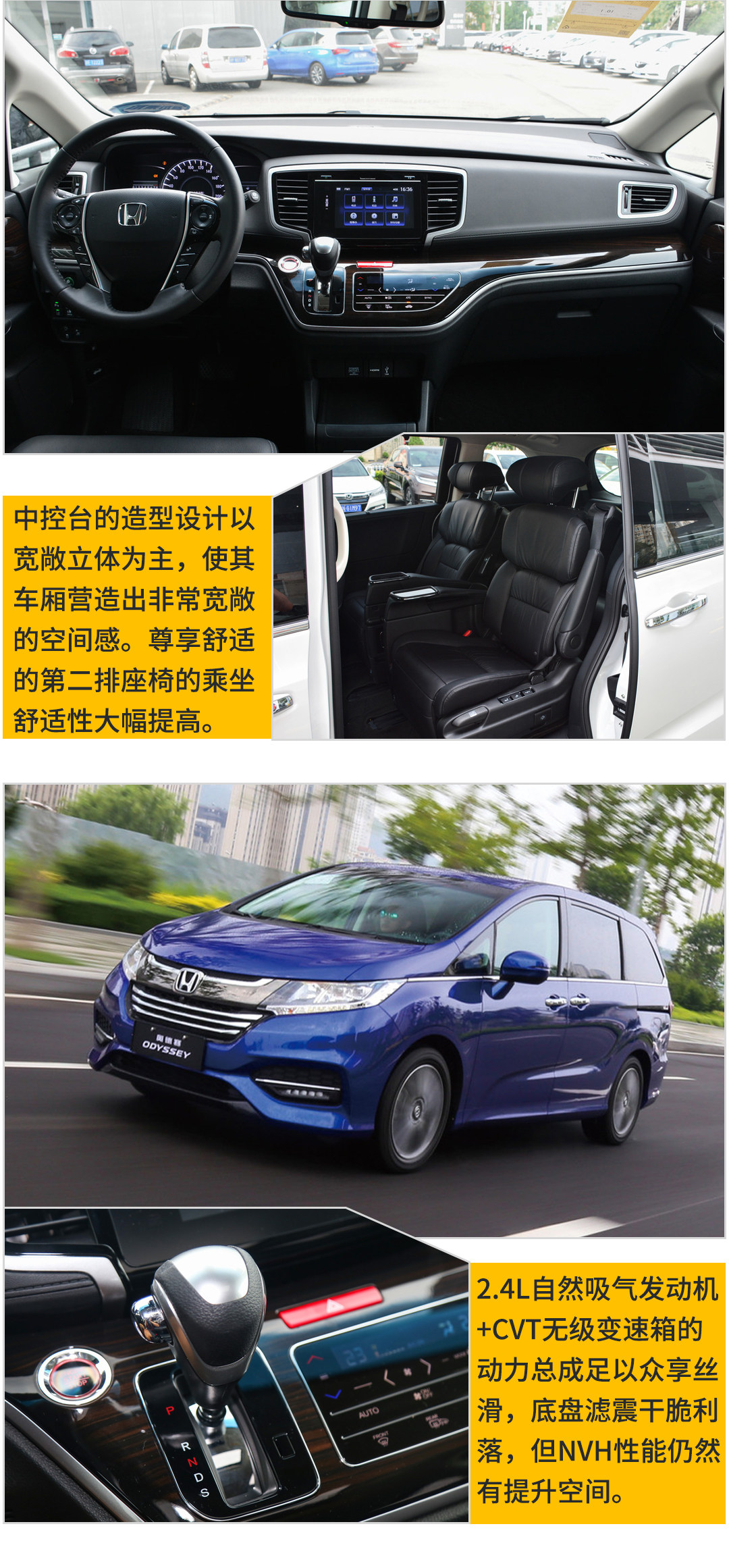 动力方面,仍然是全系配备那款地球梦2.4L自吸发动机,带可变气门正时及升程控制技术,传动系统也仍然是CVT无级变速箱。动力、平顺、省油面面俱全,但作为一款舒适至上的MPV车型,油门响应过于敏感,在起步加速时容易窜,就会比较影响驾乘体验了。