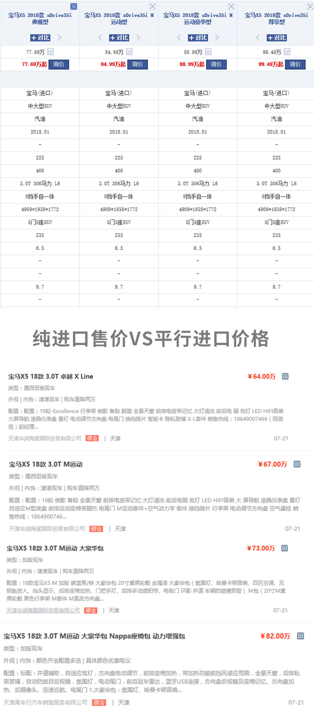 X5的平行进口车是从58万左右的xDrive25d 柴油版开始起售的,一直到70、80万的xDrive40e 混动版都有,而我们不难发现它跟国内重叠的3.0T版本只是65万起,也就是说你能用比正常渠道“乞丐版”还低的价格便能获得一辆国内中规进口高功率的X5!就是直接最少优惠了十多万,这难道不是“印度格列宁”的一种象征吗?!