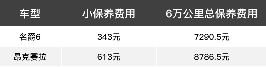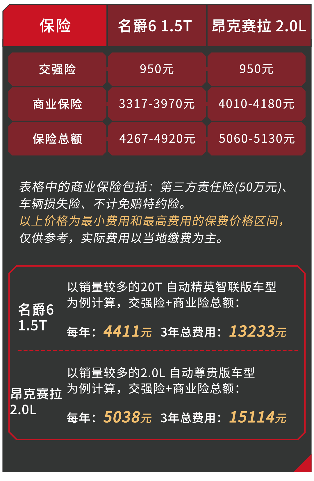 两车在6万公里的总保养费用相差了1000多块钱,在小保养费用上也有200多块钱的差距。保险方面,昂克赛拉比名爵6贵了600多块钱,三年下来就得差了1800多块钱。
