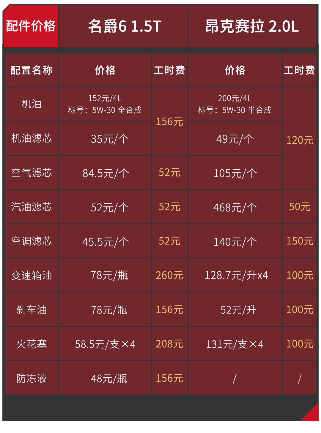 从上图可以看到,名爵6的各种损耗件价格并不高,都在一个合理的范围内。工时费最贵的是换变速箱油,不过53000公里才换一次的间隔设置合理。相比之下,昂克赛拉的配件就要昂贵不少,除了机油滤芯和刹车油外,其余配件的单价都超过100块。