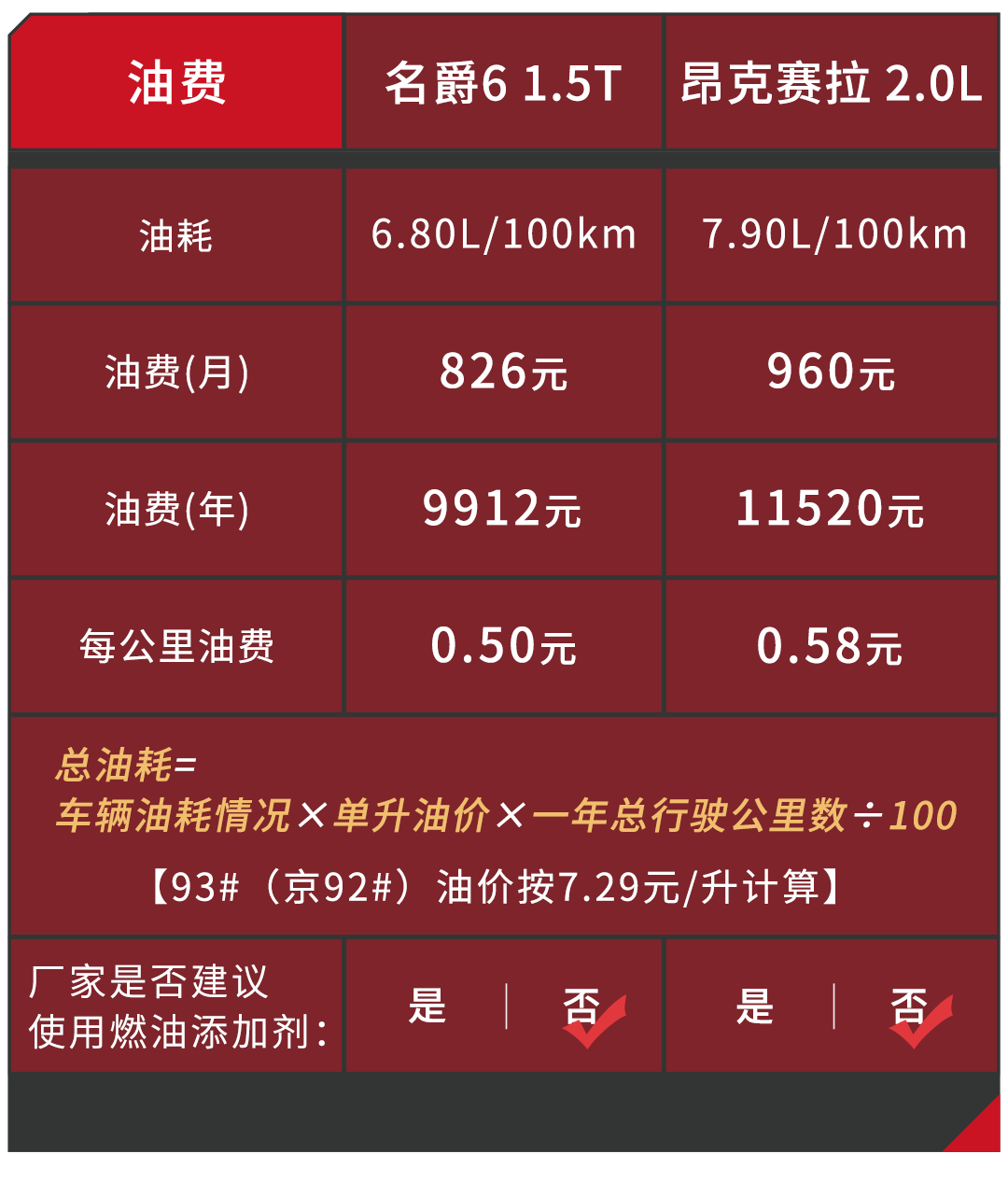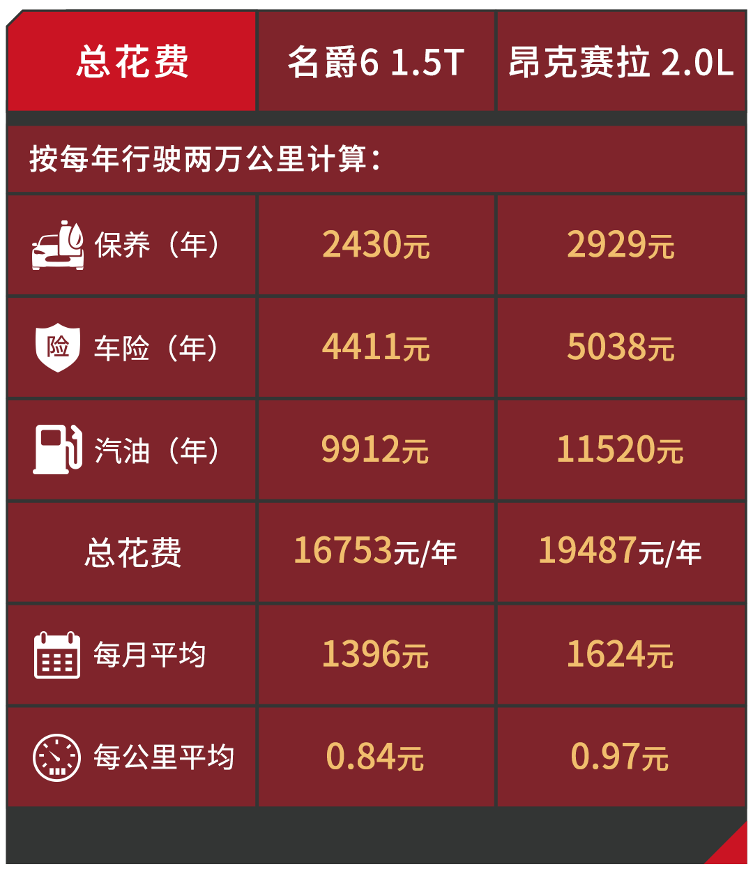 一年下来,名爵6在养车费用上就比昂克赛拉省了2700多块钱。虽然定位都是运动型A级家轿,但2.0L昂克赛拉的零百成绩仅仅9秒出头,与名爵6的7秒多相差颇大,更何况名爵6的售价还要比2.0L昂克赛拉便宜了将近5万块。