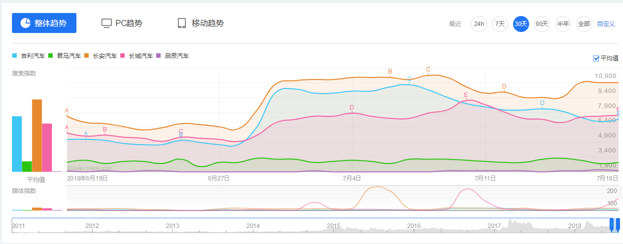 即便是发布类似的车型,一线车企的关注度也会非常高,这就好比范爷发一张自拍能有几万的点赞,而你发一张果照都只有几十人看一样,粉丝基数差异导致关注度的差距巨大,因此即便是发布实力相当的产品,二线自主车型都不优势。从百度指数来看,君马、启辰等二线车企的搜索指数、资讯指数均大大低于长安吉利等一线大厂。