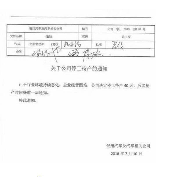不止是陆风,前些日子一张不甚美观的银翔汽车停产通知在网上流传开来,7月10日发布的这份通知表明银翔汽车决定停工待产40天,而且这份通知上赫然写着“行业环境持续恶化,企业经营困难”,这几个字看着着实让人心疼。