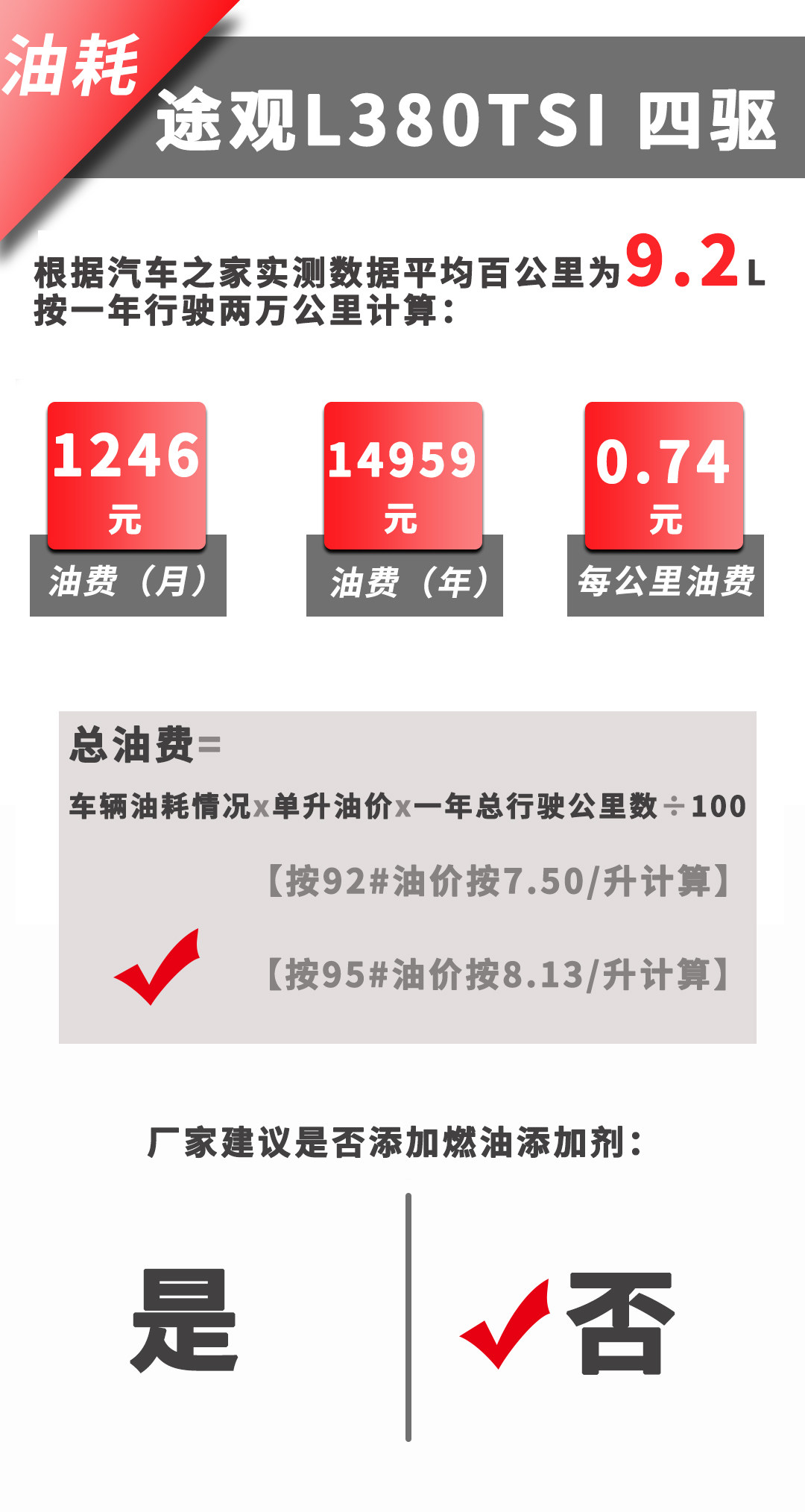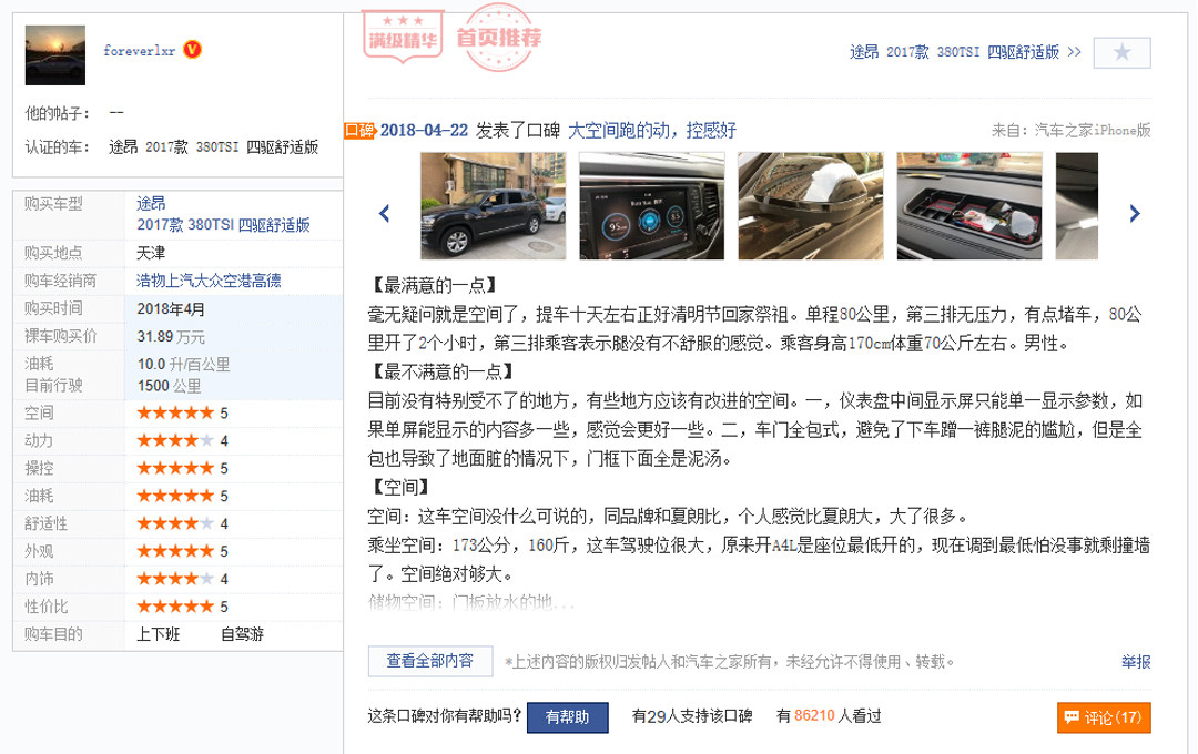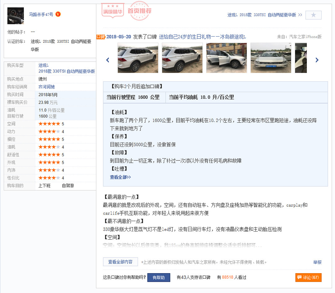 次顶配的途观L的动态表现在SUV里面算是非常好的,2.0T EA888给予了它比较“有劲”的动力表现,那当然了那是过了2000转之后的事,因为2000转以下它的涡轮迟滞还是相当严重的。底盘可圈可点保持了大众一贯水准除了较硬之外几乎挑不出任何毛病,方向盘转向精准度也做到很高的水准,静音性能更是相当优异,9.2L/100KM油耗更同级别非常优秀的水平!