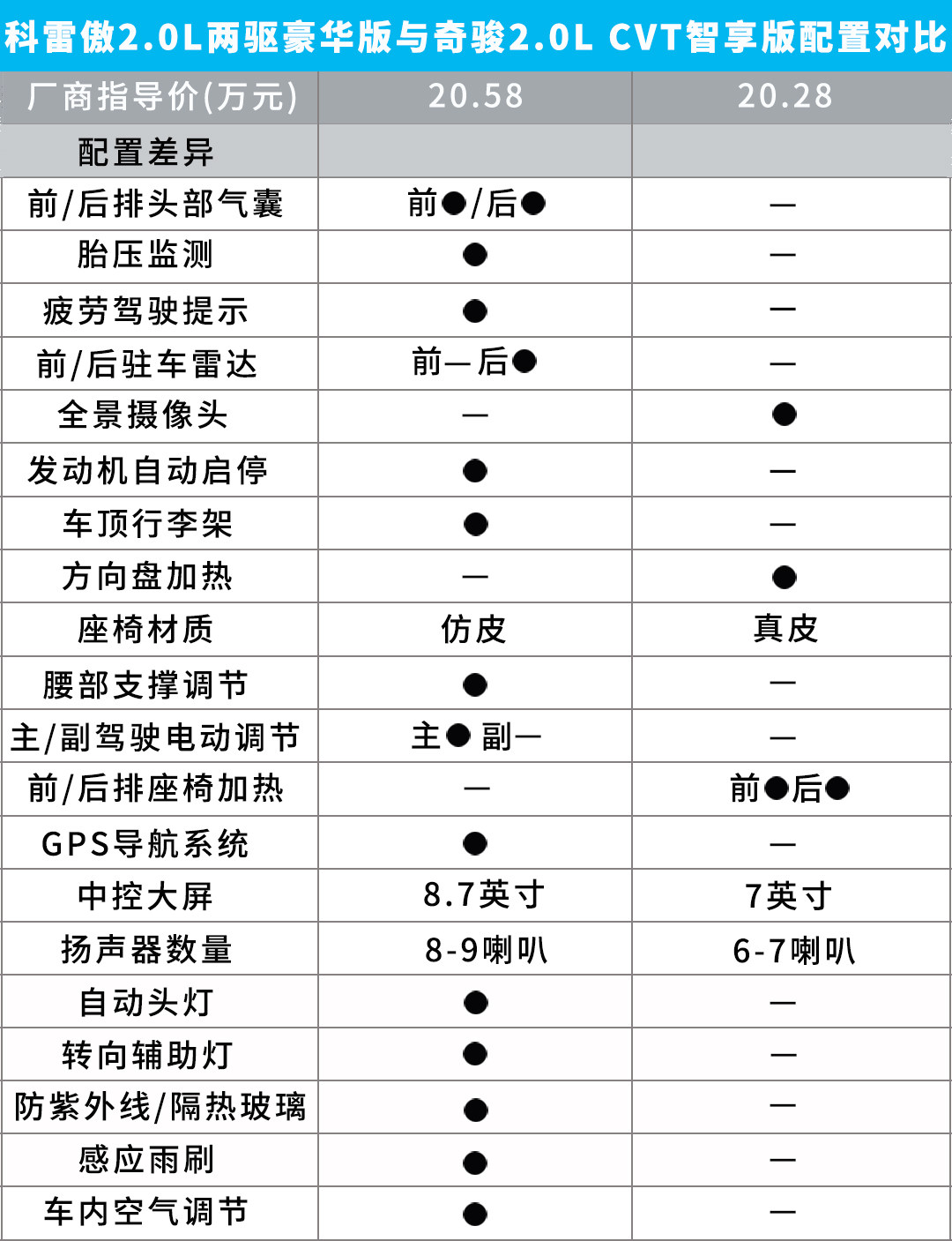 配置方面,挑选价格相近的科雷傲2.0L两驱豪华版与奇骏2.0L CVT智享版进行对比,结果一目了然,科雷傲几乎是以碾压的姿态取胜,全景摄像头、方向盘加热、前后排座椅加热的配备算是为奇骏挽回了一点分数,但总体对比下来还是略显寒酸。