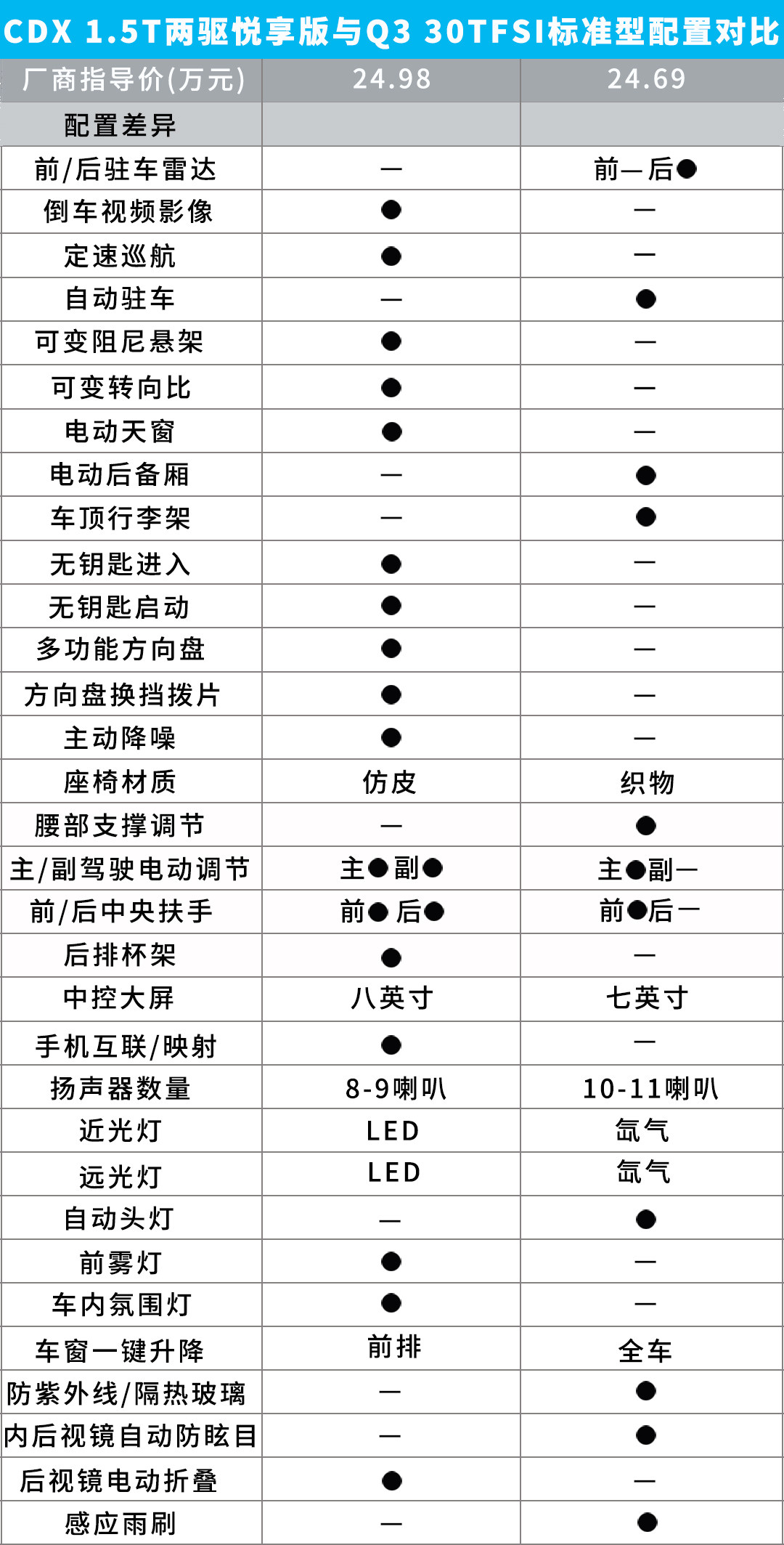 讴歌CDX整体配置水平比奥迪Q3略高,许多诸如可变阻尼悬架、主动降噪、车内氛围灯等同级少见的配置都有配备,但Q3配置表现也可圈可点,比CDX多出了自动驻车、电动后备厢、自动头灯、全车车窗一键升降等配置,都是消费者日常用到的,同样值得点赞。