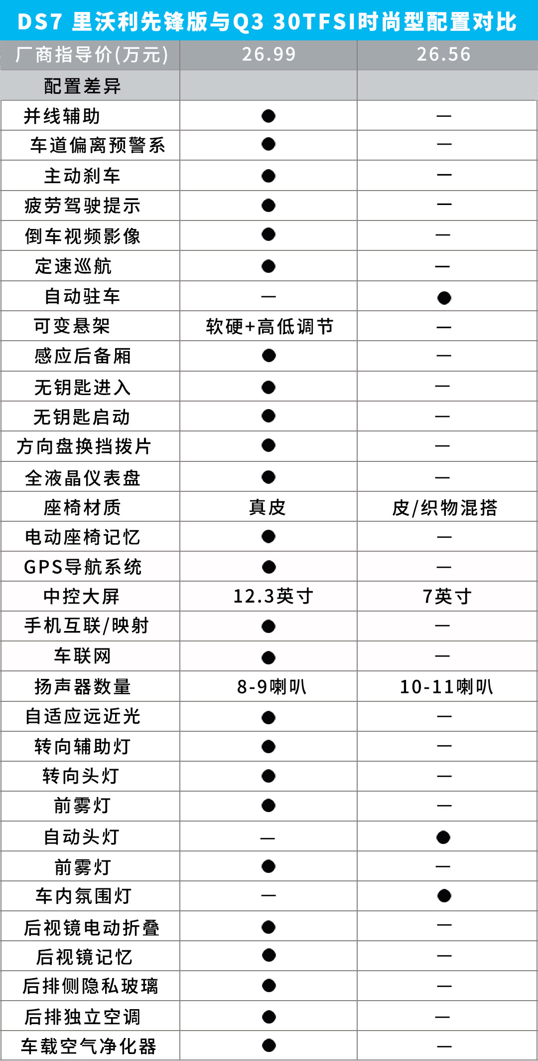 看了这份配置对比表我想不用再多说什么,奥迪Q3算是BBA里面配置较高,性价比较好的一位选手,DS7在配置上实现了对Q3的全面碾压,说明也实现了对BBA同级别车型配置水平的全面超越,这是应当的,毕竟作为后来者,想要超越前面的大哥们,必须拿出点诚意。