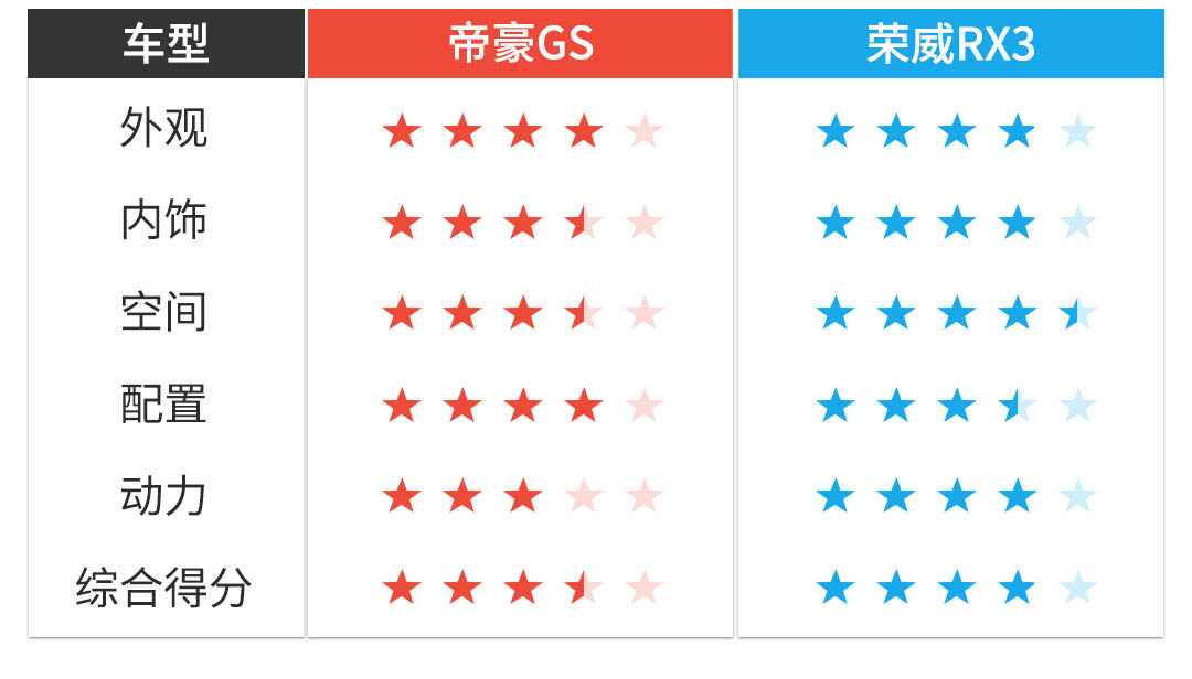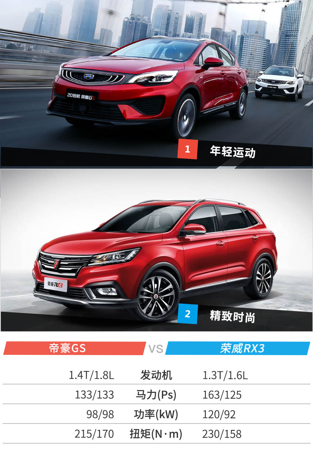 总结:作为当下比较热门亲民的两款紧凑型SUV,两者的实力不相上下,各有优势。对比了二者的各项表现,帝豪GS配置方面更加有优势,而荣威RX3在做工,底盘以及空间,动力方面表现无疑是胜过帝豪GS的。荣威RX3比较适合已婚年轻人,推荐1.6L手动互联网智享版。而帝豪GS则是未婚同时又热血的年轻人的首选,推荐1.4T领潮版 自动臻尚智联型。