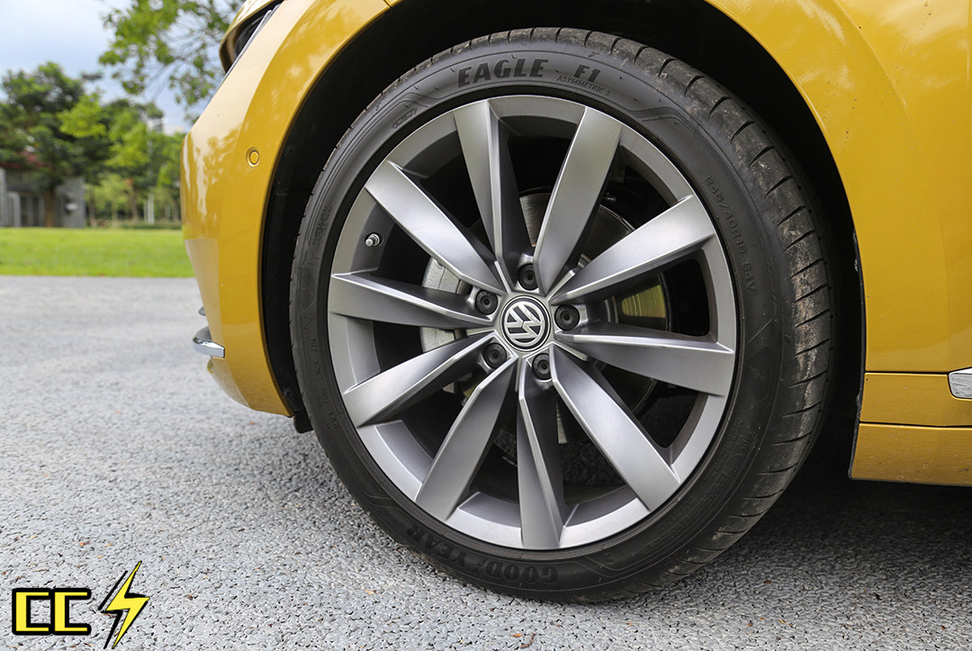 19英寸高亮双五辐式轮圈视觉效果出众,造型向初代CC致敬,搭配主打操控和干地抓地力的固特异EAGLE F1轮胎(245/40 R19)。提前来个小剧透,试驾车型实测100-0km/h制动距离仅需33m!什么水平?比肩保时捷718的逆天水平。(不排除是试装车缘故)