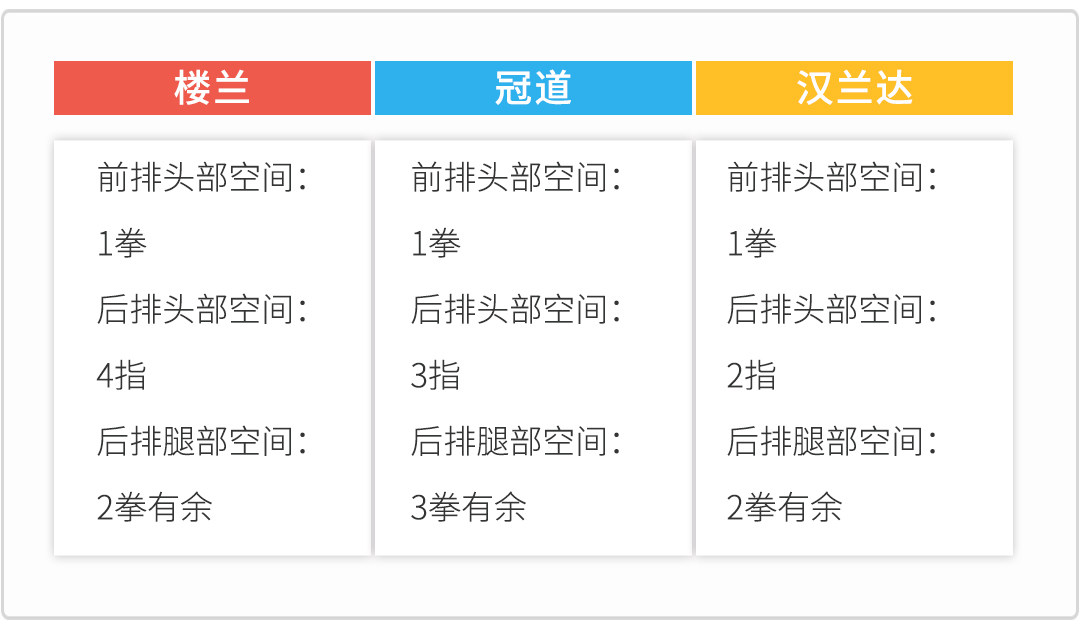 对三款车型初步了解后,马上回到我们的正题,这些日系SUV空间表现怎么样?我们收集到三组都是又4500px的试乘员通过常规测量方法得出的数据,其中汉兰达为5座版。总得来看三款车的前后排空间在同级都不算突出,算是比较标准的水平,只有冠道的后排腿部空间表现是比较突出了。