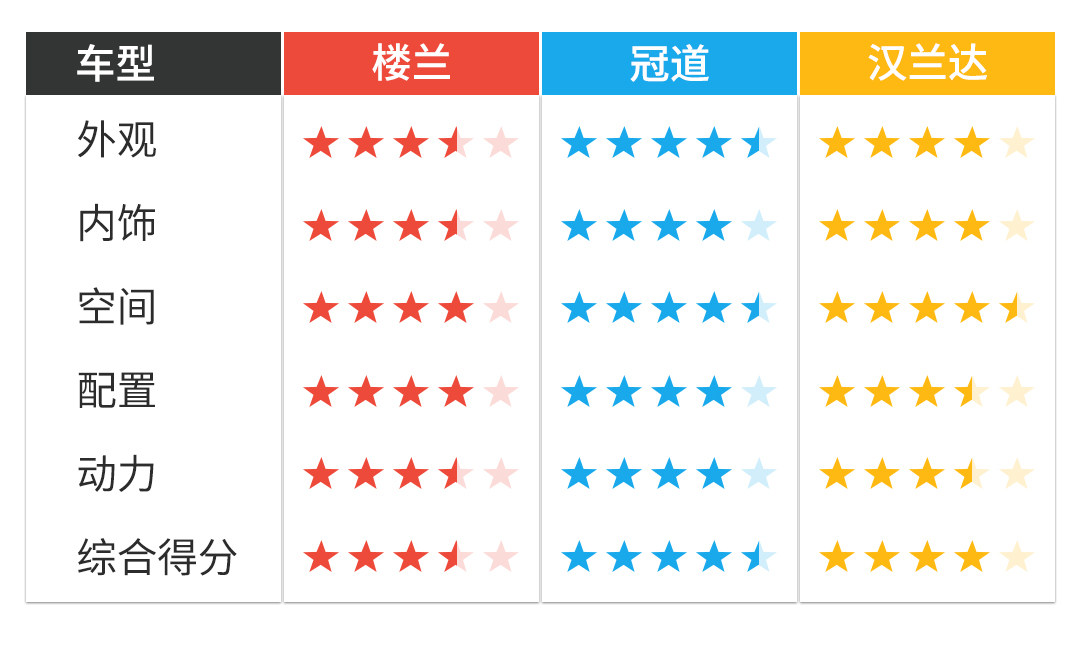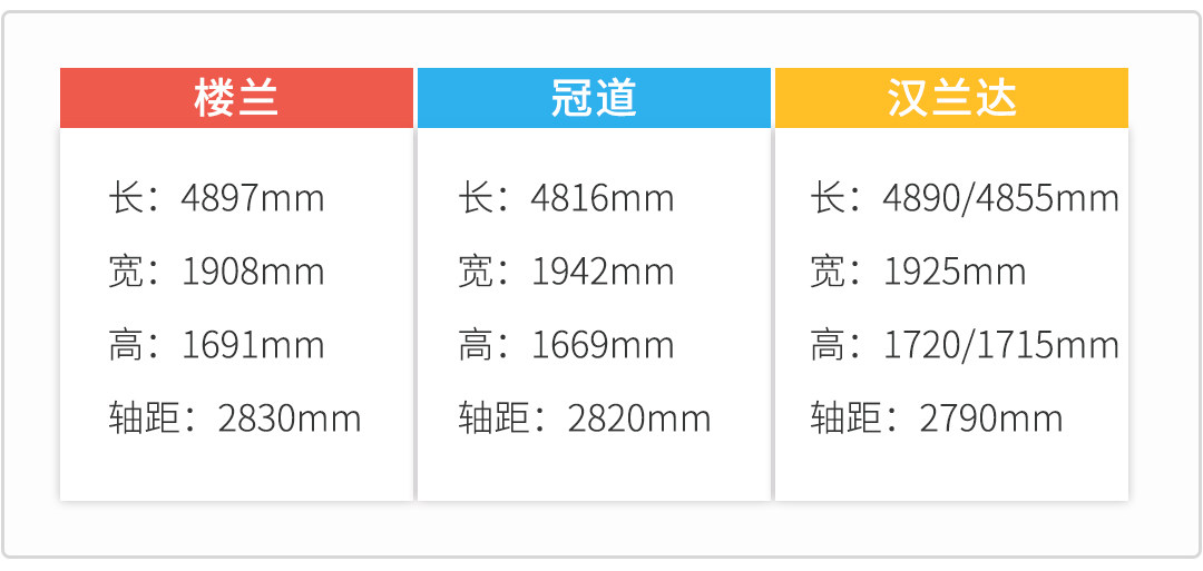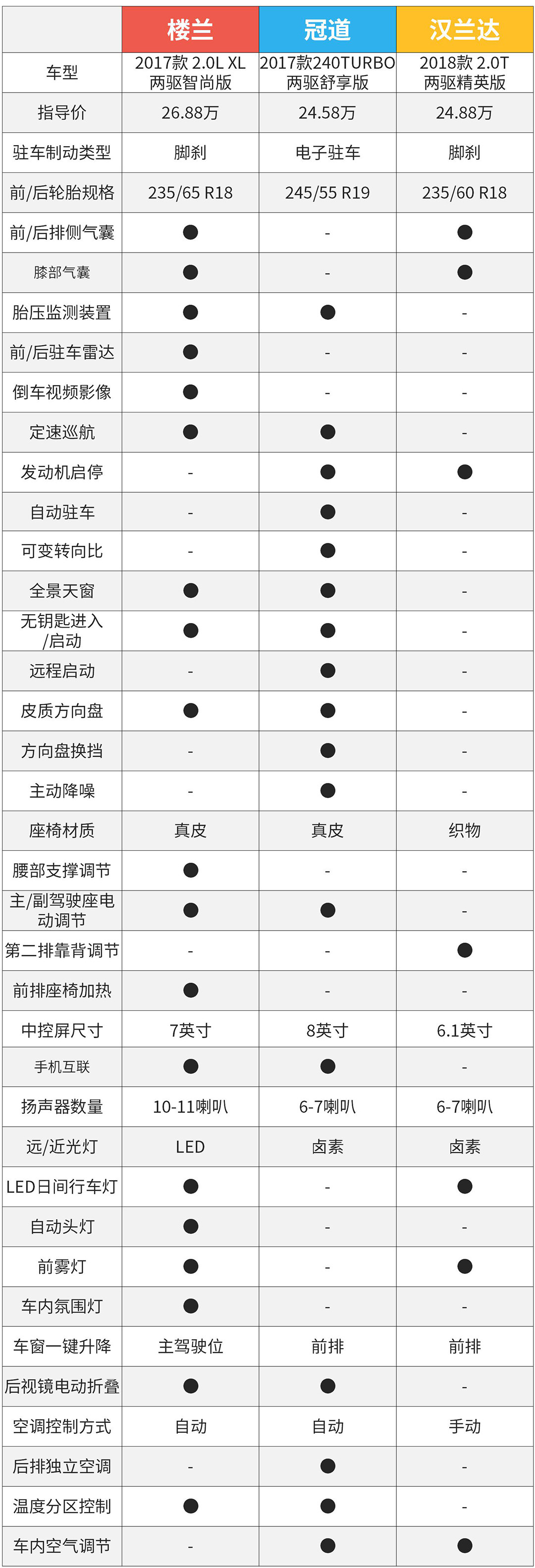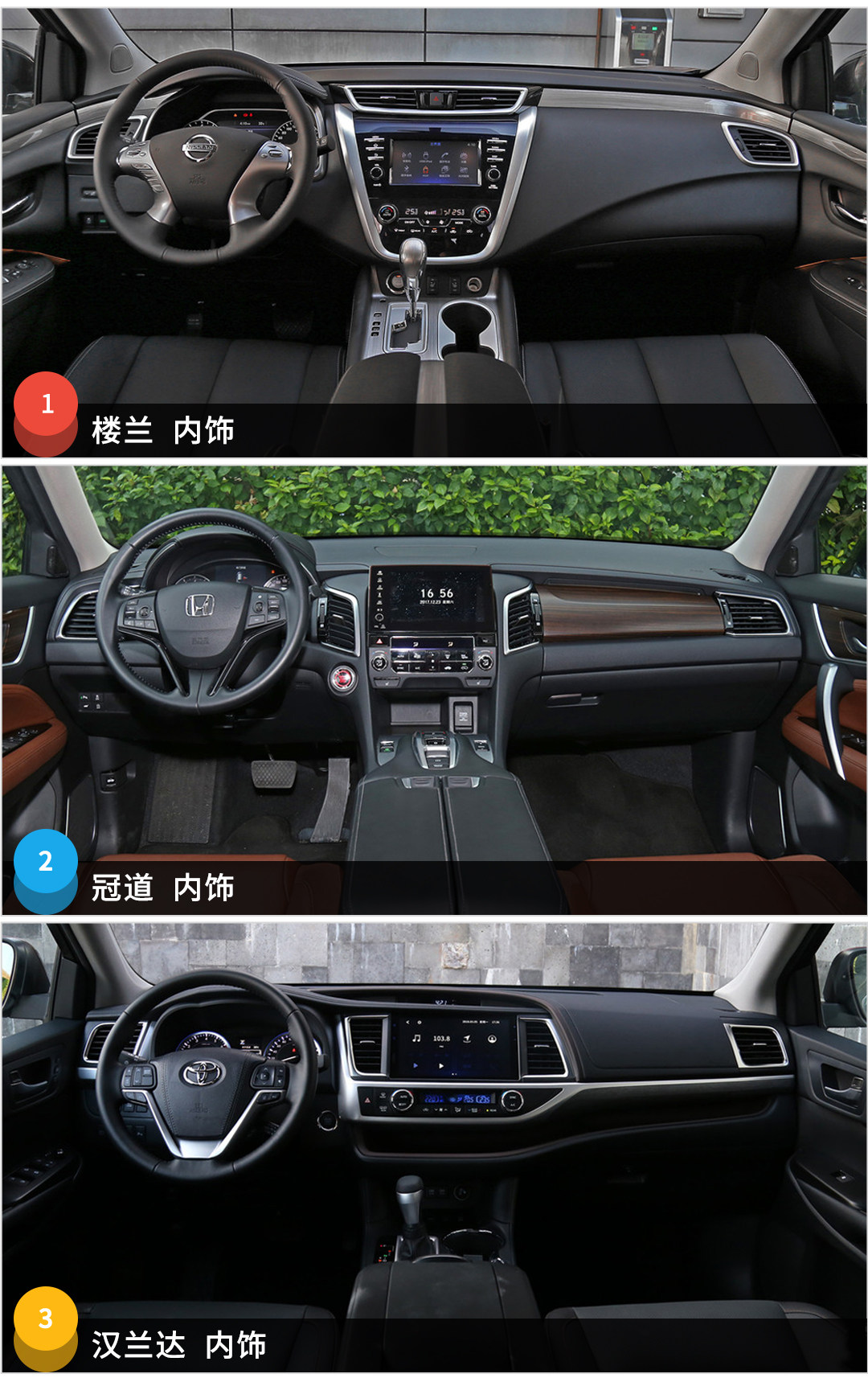 内饰不是我们这次对比的重点,但内饰也必然重要,所以也想发表一下个人观点,楼兰的内饰设计注重高级感,用料也绝对够,三款车中最大气。冠道内饰更规整,对称感好,木纹饰板的点缀也有高级感。汉兰达则最居家,比较注重实用性,使用起来很方面。三款车的内饰我个人都很喜欢,硬是要选可能会选冠道吧,显得稍微时尚一点。