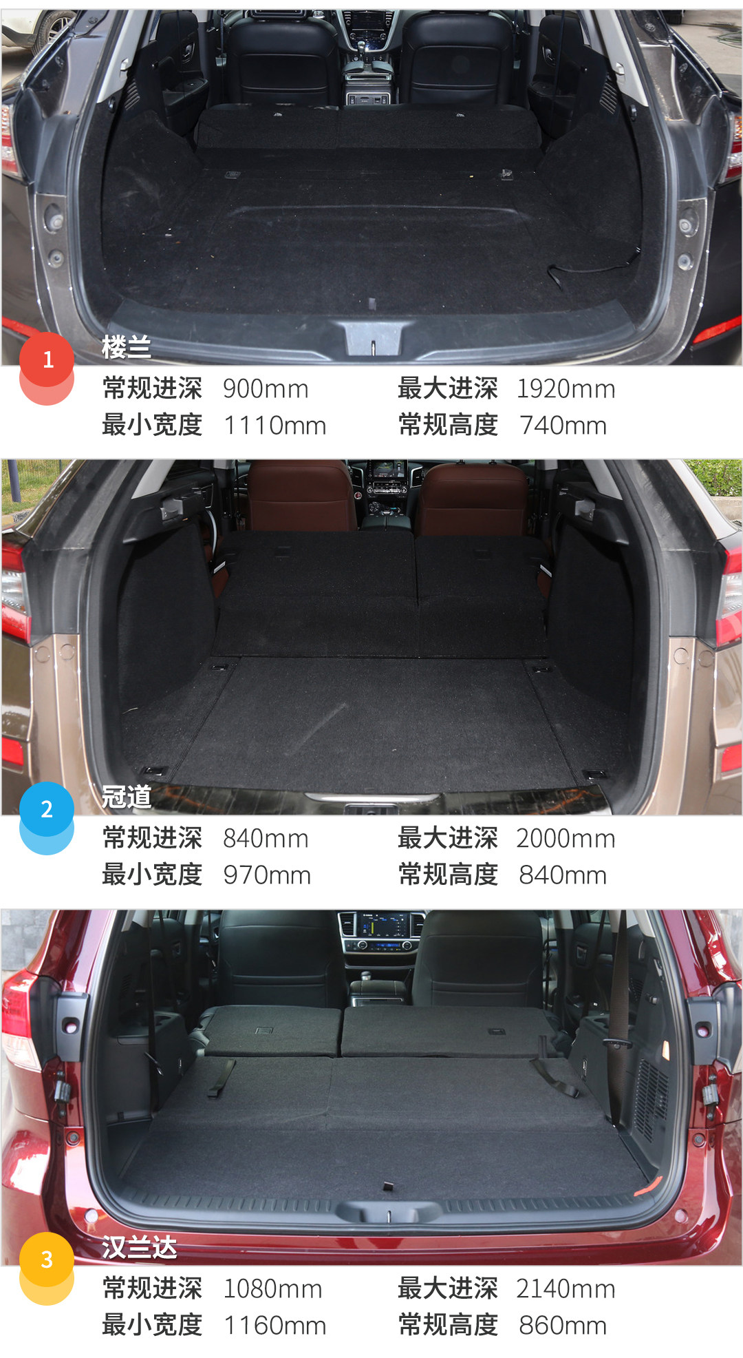 从数据中可以看出,汉兰达的行李箱空间是最有优势的,即使是与同级的所有车型比,表现都尤为突出。而楼兰和冠道的水平就与同级的途观L或柯迪亚克差不多,但又比探界者和昂科威好很多,所以还算比较上乘。