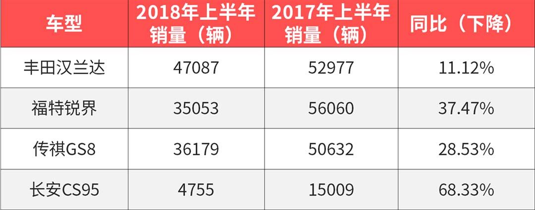 对比2017年前6个月的销量,曾经那个加价排队抢破头的中型SUV标杆汉兰达同比下降11.12%,作为汉兰达最强而有力竞争者的锐界也未能幸免于难同比下降37.47%。而长安和传祺的头牌,CS95和GS8同比下降68.33%和28.53%。被认为汽车市场下一个风口的七座SUV为何会遭遇冷落?