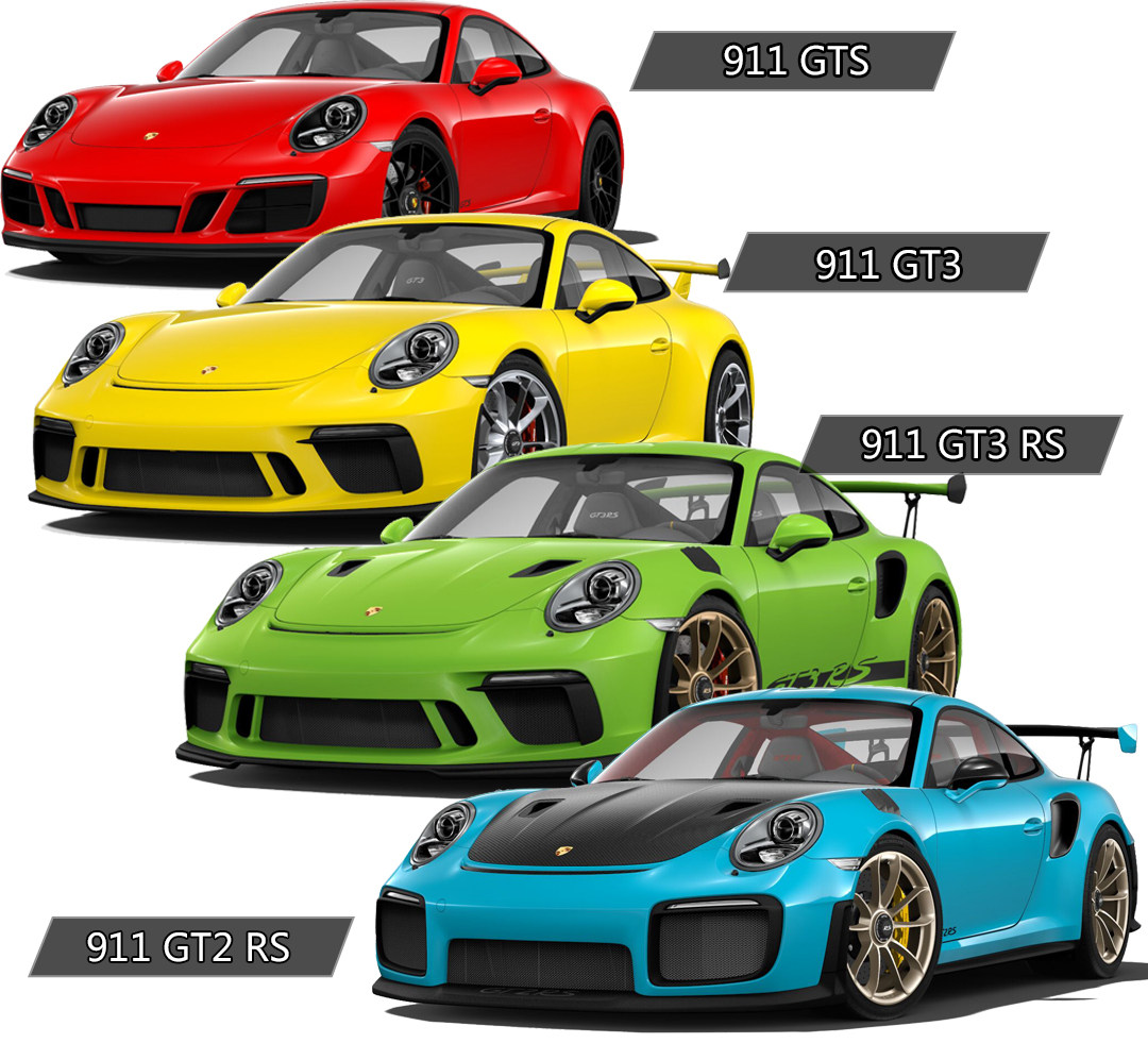 Carrera → Carrera S → GTS → GT3 → GT3 RS → Turbo → Turbo S → GT2 RS