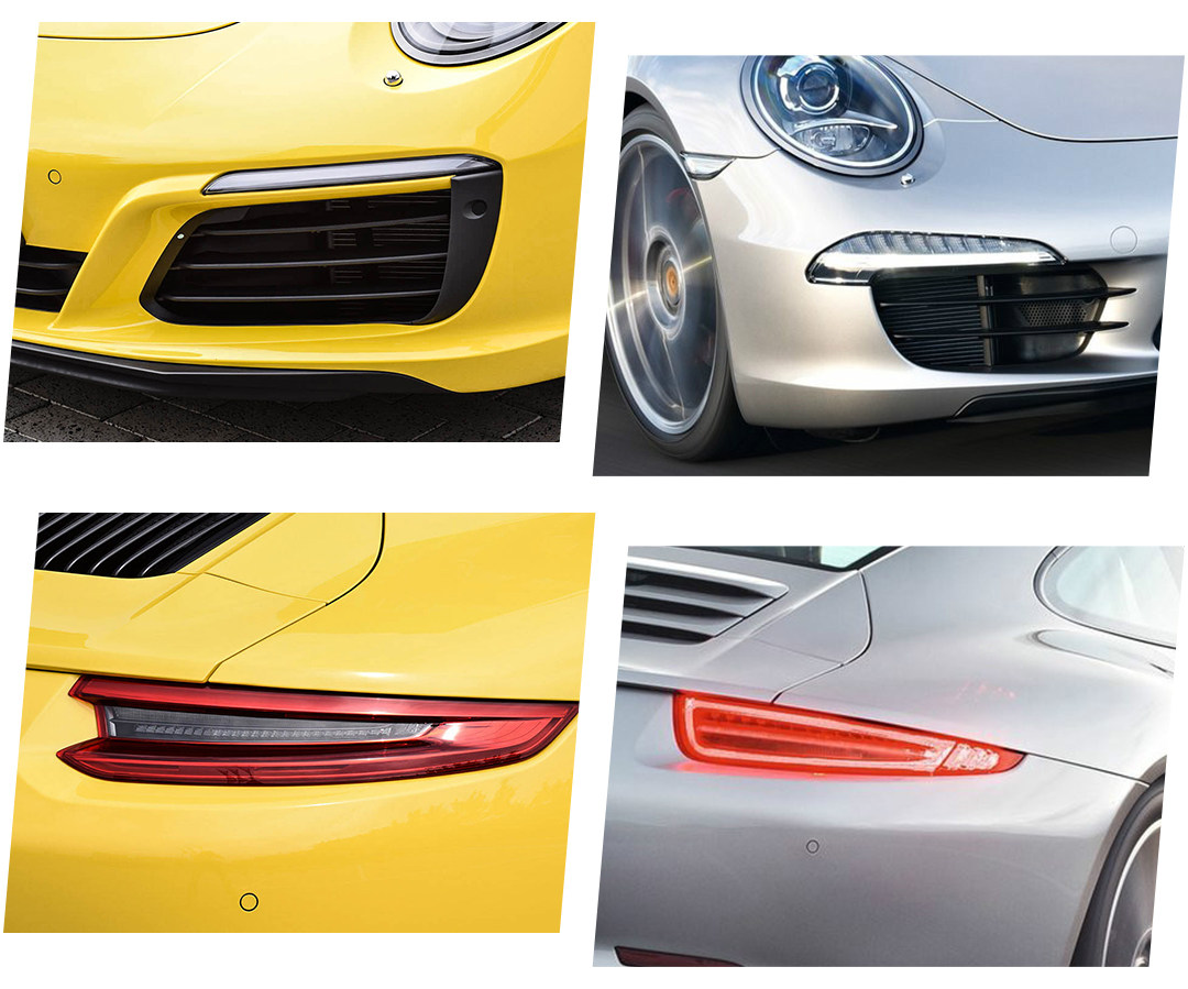 2015年款后的991.2外观的调整在于灯组设计上,主要是转向灯和尾灯,LED灯造型细长而且协调地融入在两侧进气孔上方,尾灯是更加立体和精致,991.1亮起是一个轮廓,991.2尾灯亮起是一个尖角,并且都有四个高亮灯。
