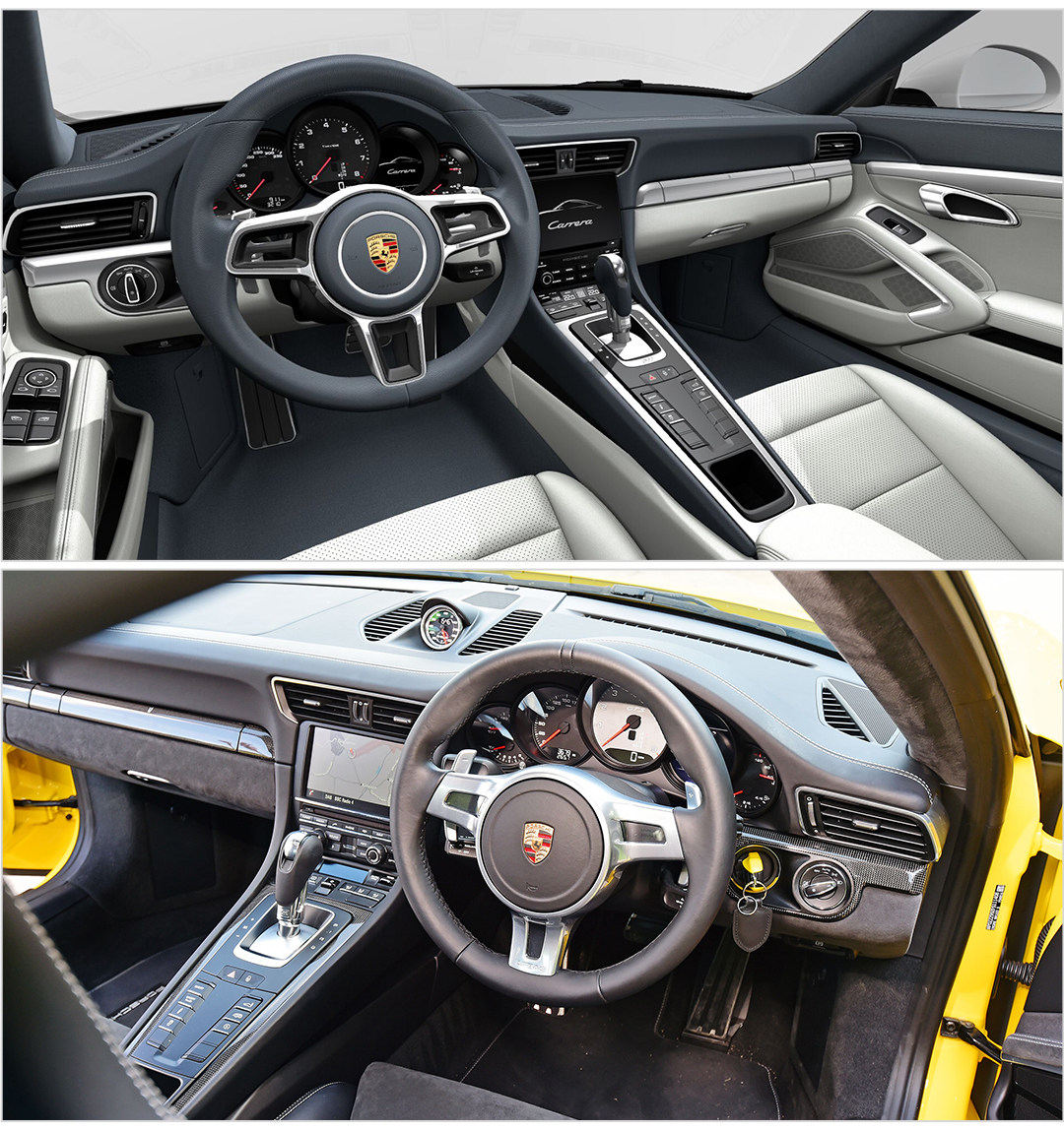 内饰改变就比较大了,2015年款后是全新的内饰,方向盘是和神车918同款的镂空方向盘,而991.1的内饰则略显年代。