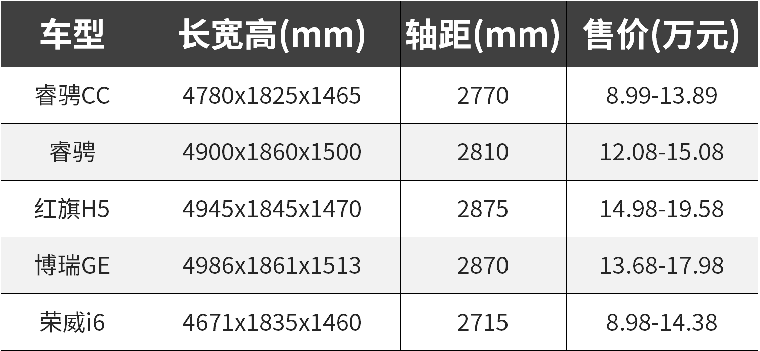 睿骋CC在定位上把自己当成是一台中型车,但是从实际尺寸来看,睿骋CC算一台A+级轿车。比起市面上价格更贵的B级车,睿骋CC的价格更便宜,但是空间没有别人宽敞舒适。比起MG6、荣威i6等紧凑型车,睿骋CC的空间有优势,但是动力没有别人好。总的来说,睿骋CC值得家庭用户选购。