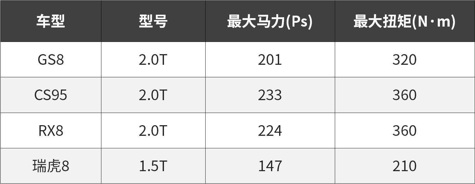 以上提及的三款车型全部都配备了代表自己最高发动机制造水平的2.0T发动机,最大马力都在200匹以上,非常接近合资车的水平。但是瑞虎8仅搭载了一款1.5T的发动机。其最大功率只有147马力,最大扭矩只有210牛·米,仅有对手的三分之二左右。所以这价格还是很合理的。