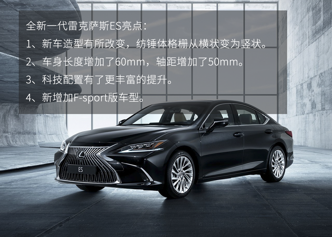 全新一代雷克萨斯ES在外观上有着比较大的改动,利用上了全新的家族设计。新车前脸整体保留了纺锤体格栅的设计,但现款的横状格栅已经变为竖状,看上去显得更大气稳重。而不同版本车型的前格栅存在区别,以彰显个性。F-sport版车型的前格栅采用的是类似交织状的设计元素,运动且激进,强烈地突出其个性。无论是哪种前格栅设计搭配上两侧造型犀利的半分离式造型的LED大灯组,以及钩形LED日间行车灯,都十分协调,更赋予了新车不错的辨识度。