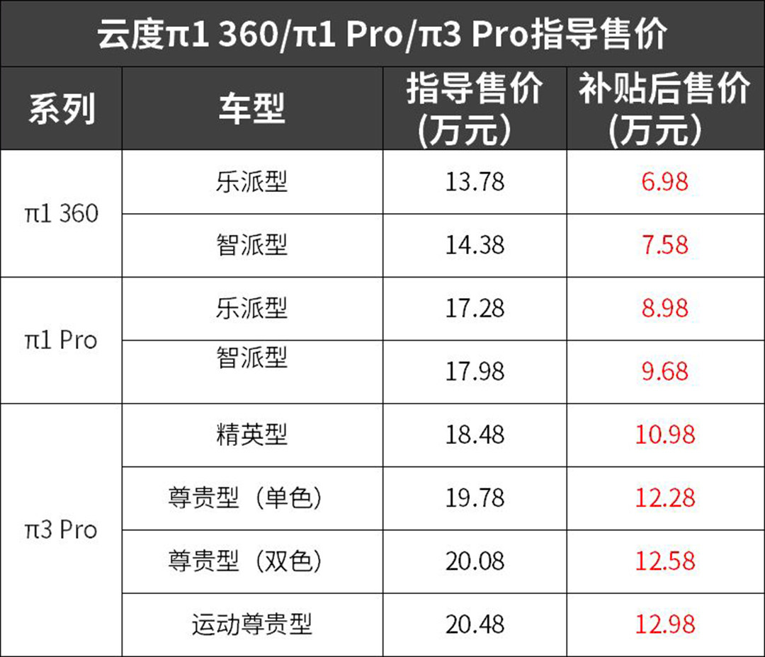 云度π1 360/Pro和π3 Pro是中国新能源时代涌现出来的年轻车型。年轻有年轻的优点,它们外观可以个性前卫,不受拘束,内饰可以大胆勾勒科技未来之风,让消费者的感官都饱受冲击。但同时由于缺乏造车底蕴和设计经验,而导致工艺水平跟不上,车身尺寸及乘坐空间规划失当等缺点也在这一代车型上体现得比较明显,相比预售价,6.98万元起的补贴后售价确认给了市场不少惊喜,如果您有十万内城市代步车需求,并有上牌压力,对内饰质感及乘坐空间并不是刚需,这款车是可以列入考虑的。同时希望云度能持续改进,未来带给我们更多优质的新能源车款,毕竟新能源时代消费者的需求远不仅限于续航里程,让我们共同期待吧。