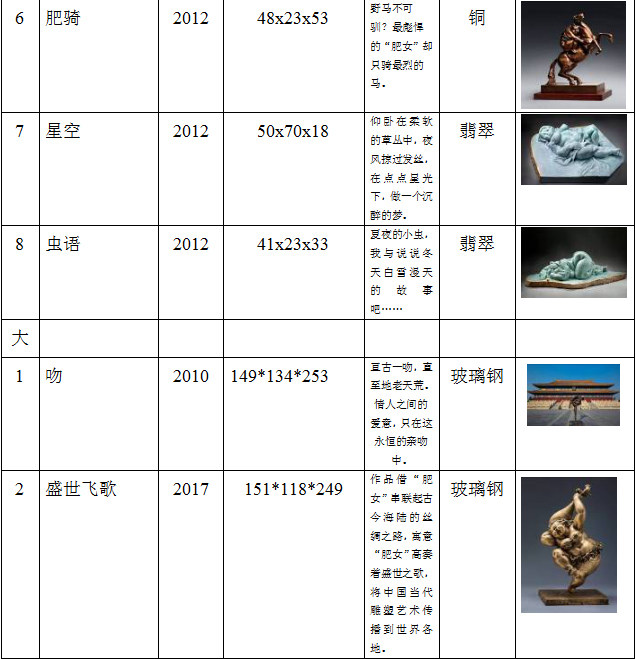 从事雕塑艺术创作二十多年,创作了一系列雕塑作品。其凸显个人艺术风格的“肥女”系列作品,动静结合,以诙谐、幽默的雕塑语言,雕刻人们喜闻乐见、趣妙横生的生活情景,作品深受人们喜爱。各类报纸、杂志刊载了大量作品和评论,国内外数家电视台和各种报纸、杂志等媒体作了众多采访报道。