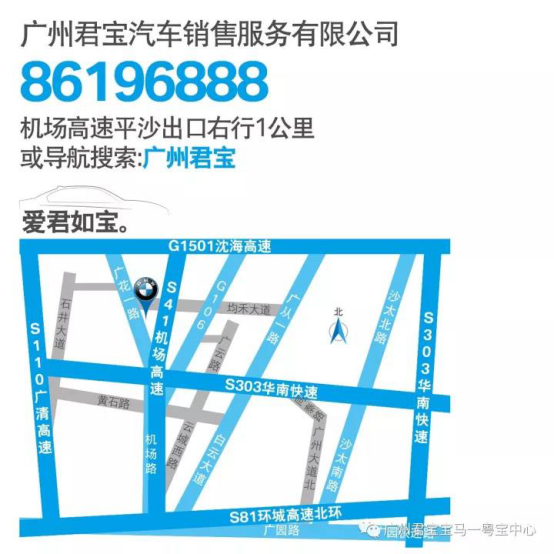 广州君宝汽车销售服务有限公司,简称广州君宝·粤宝中心,坐镇白云区广花一路136-1号,S41机场高速或S303华南快速路经平沙出口右行1公里即可到达,辐射范围南至机场路沿线,北至白云空港经济区。销售展厅展示和销售BMW全系车型(1系/2系/3系/4系/5系/6系/7系/X系/M系等),占地15000 平方米的售后服务中心随时恭候光临。