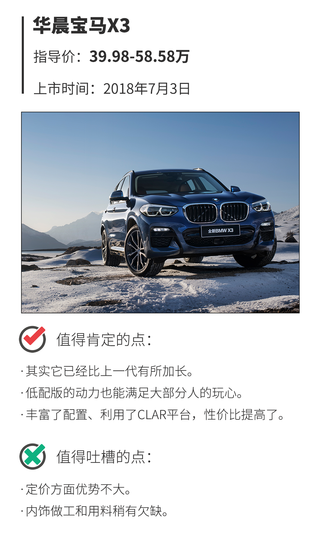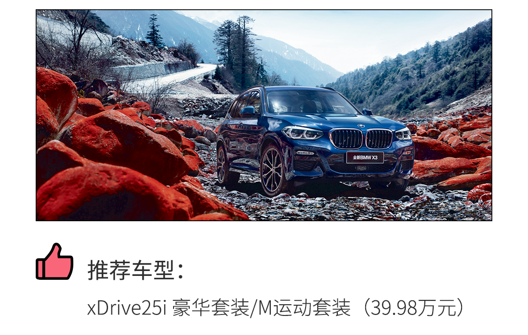 低配车型具备的配置可以说是比同级别的奔驰GLC、奥迪Q5L稍微优秀,这也是笔者更想给大家推荐低配版车型的原因。再者,如果你是对运动性能稍微有点追求的,那尽管是低功率版的华晨宝马X3(全时四驱,2.0T,最大马力184Ps,最大扭矩290N·m),也是能满足日常突如其来的玩心。