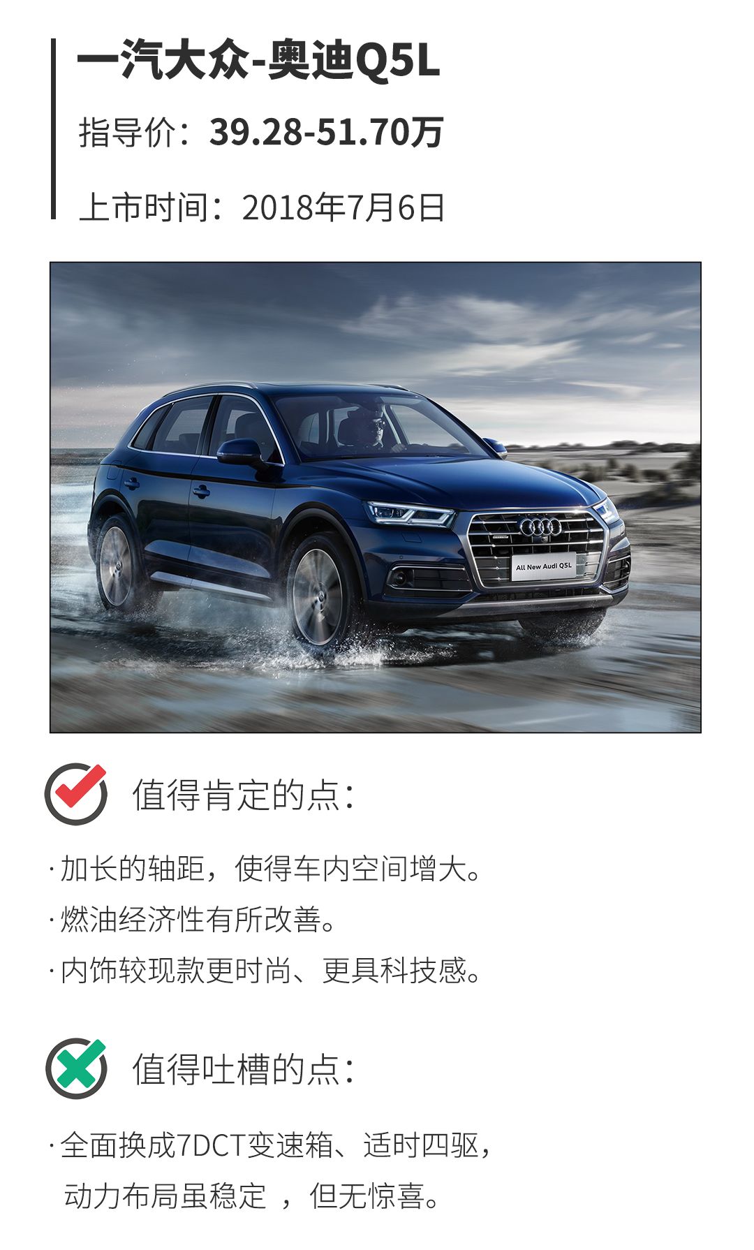 虽然很多人在Q5L上市后,一直吐槽全时四驱变为适时四驱了,但是油耗得以降低这对消费者来说何尝不是一件好事呢?更何况选择Q5的消费者向来都是城市用车为主。所以想要家用层面更综合全能的豪华SUV,那考虑Q5L还是真的一个不错的选择。