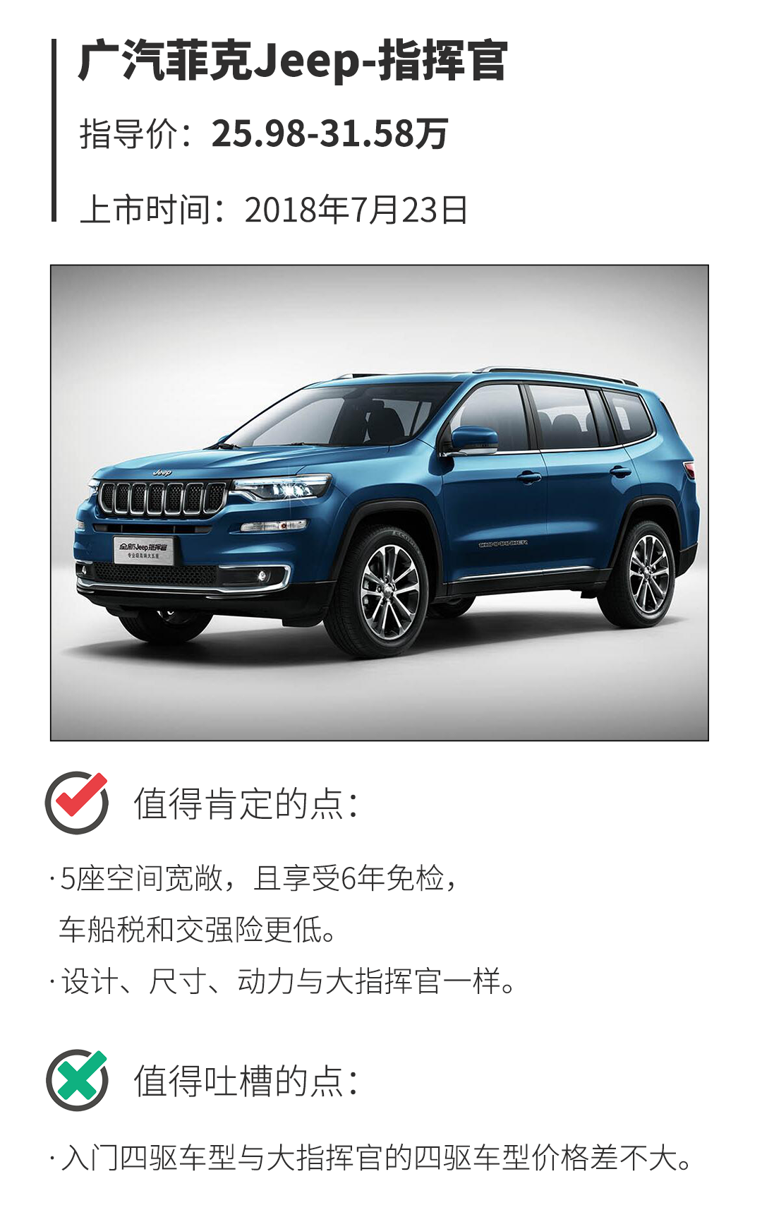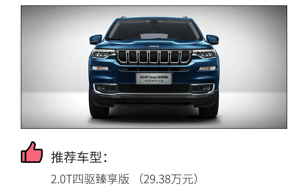 一样的设计、一样的尺寸、一样的动力、配置水平没落下,指挥官完全可以看做是大指挥官的5座版本。霸气的外观、豪华的内饰设计、大马力的指挥官的确蛮讨喜的,它的推出能很好地满足那些对7座没有刚需、喜欢大指挥官又因价格偏贵犹豫不决的消费者。