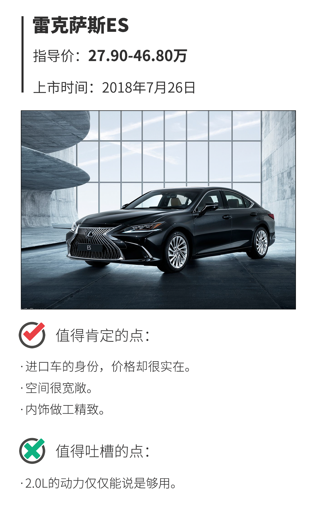 如果大家要跟笔者吐槽它2.0L的动力,那只能不好意思地说一句,从雷克萨斯ES上追求澎湃刺激动力这做法在笔者眼中看来就是伪命题,这种感觉像是要求一个穿着西装的绅士下赛道进行耐力赛一样无厘头。优雅舒适地开车难道不好吗?回到正题,笔者这里还要给大家推荐混动版本的低配车型(ES 300h卓越版),拥有强大又靠谱的混合动力技术的雷克萨斯ES卖35万左右,真的挺值得的,想买ES 260的不如努力一把直接上混合动力版。
