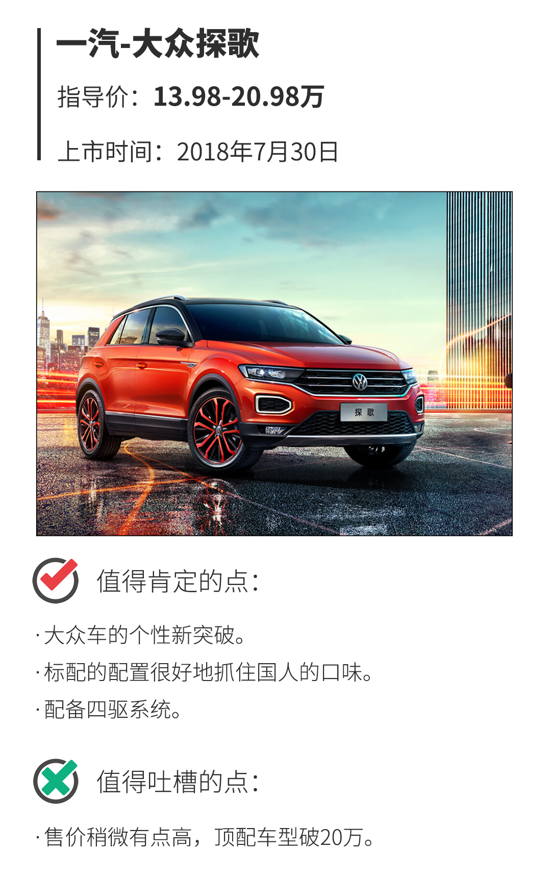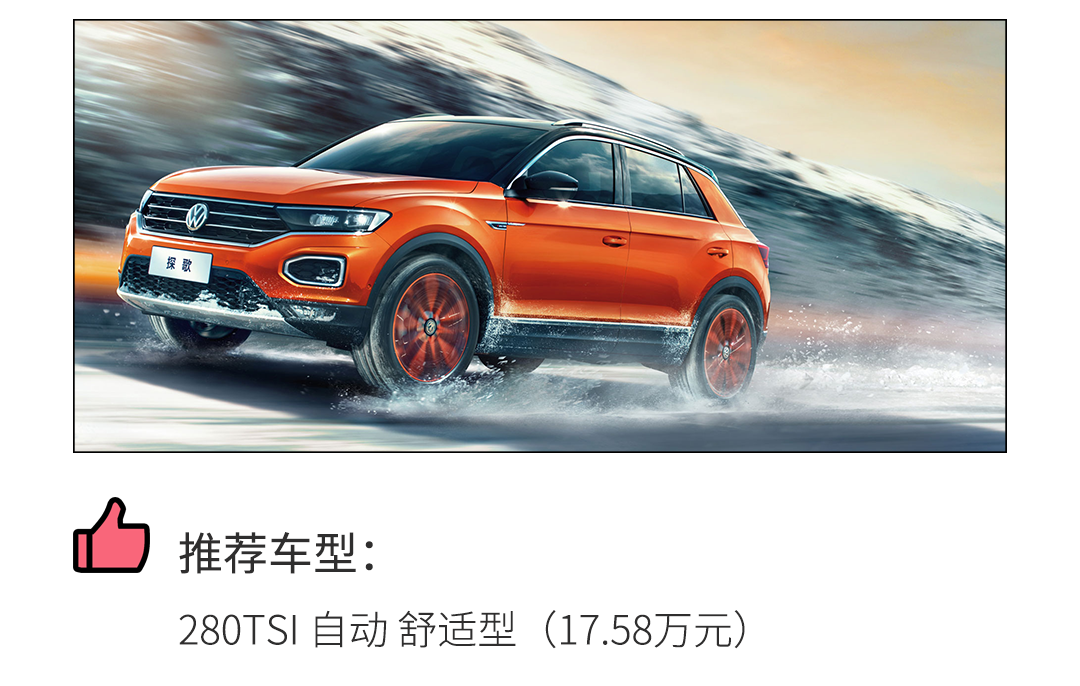 一汽-大众探歌在笔者眼中是一款产品力没毛病的车型,一汽-大众将其及时推出也是一个明智之举。如果你需要一款带有一点小个性但又不想太过高调的、品质可靠稳定的紧凑型合资SUV,笔者想给大家推荐的是探歌280TSI 自动 舒适型,除了拥有高功率1.4T发动机所能获得更强的动力体验之外,配置还能很好地满足日常需求,17万出头的价格也在可接受范围内,实属性价比之选。