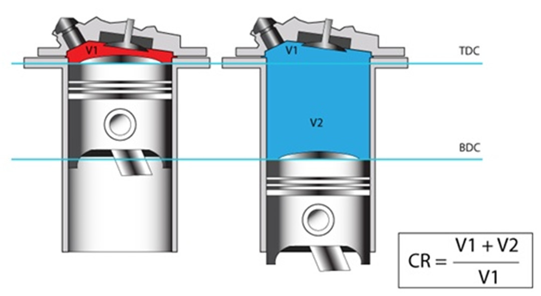 压缩比是引擎内气缸的总容积与燃烧室容积之比,表示气缸内混合气在点火时被压缩的程度。由于高压缩比下可得到更大的混合气燃烧的膨胀率,令气缸内产生适当的涡流与紊流效果,使燃油能够更快的与空气混合,因此压缩比越高,可燃气燃烧的速度越快,气缸内压力也会越高,同时也意味着引擎的燃烧效率也越高(由于增压发动机进入气缸的空气拥有极高的压力,如果引擎压缩比过高会导致压力过大而损坏引擎,因此增压发动机压缩比通常都不大,不在讨论范围内),因此如何提高压缩比成为各大厂商深究的课题之一。