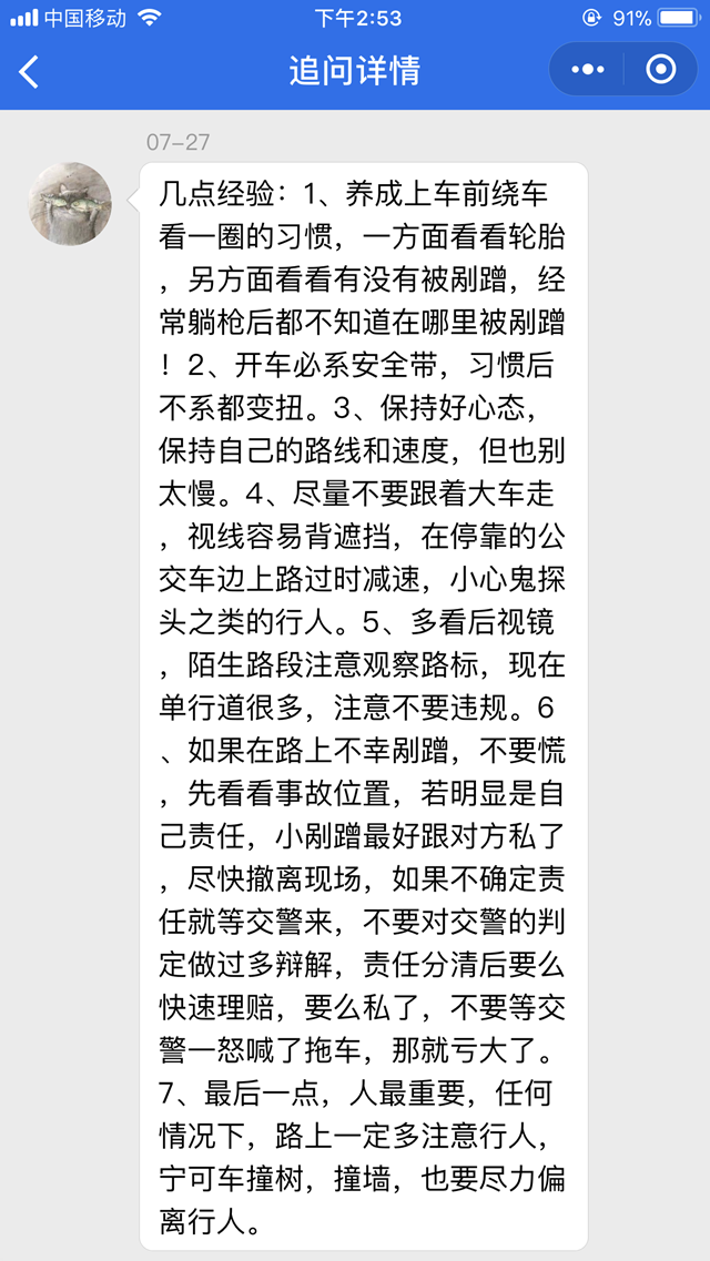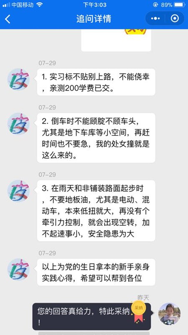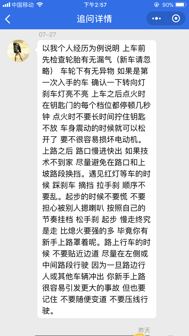 早前的好几期活动,都有很多粉丝反映获奖人数太少了,因此,经过我们考虑之后,决定来一期大的,让更多技师都能获得奖励。这一期大擂台活动的问题是“新手开车上路需要注意什么”,经过五天的采集,一共收到了200人的回复,看来大家都很喜欢这种评选方式,最终,我们一共有30位技师入围并获得了奖励。如果你也想获得奖励,记得要时刻关注我们玩车问问小程序,提早参与,回复用心专业,就能通过我们的筛选入围,最终获得奖励。下面是本次活动精选的一些精选回复,排名不分先后。