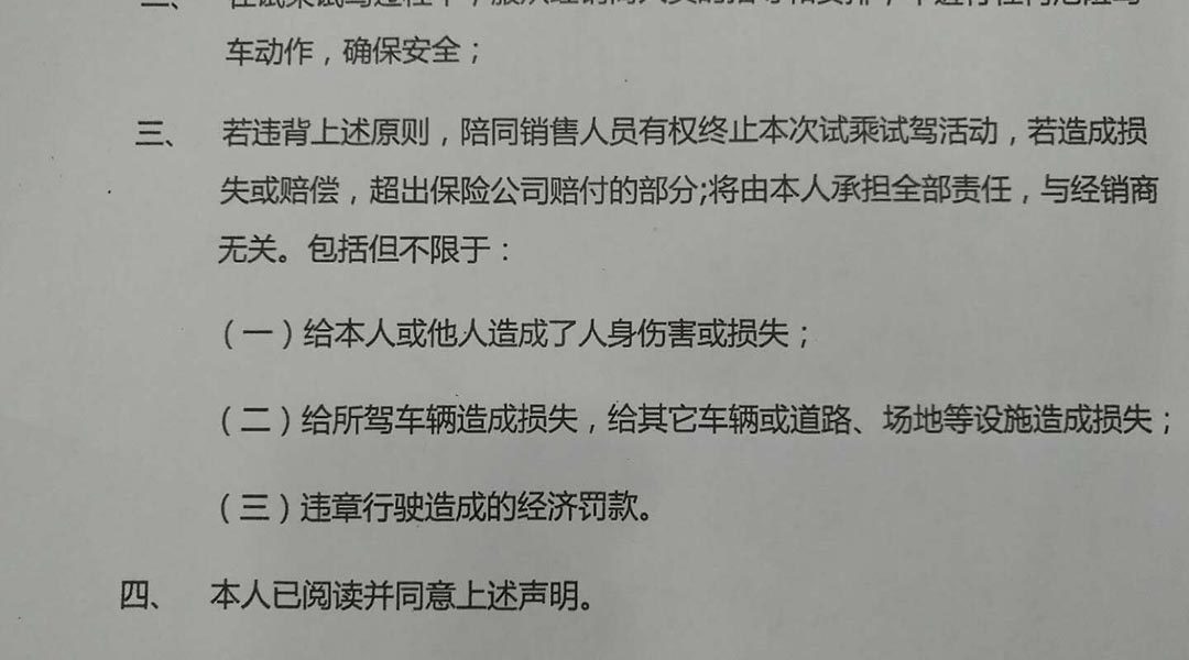 第二个重点,关于试驾协议,可能很多消费者看都不看几眼就签名了,如果试驾过程中没有出事那倒无所谓,但是如果发生意外,试驾协议上面的条款则会成为解决纠纷的法律依据。