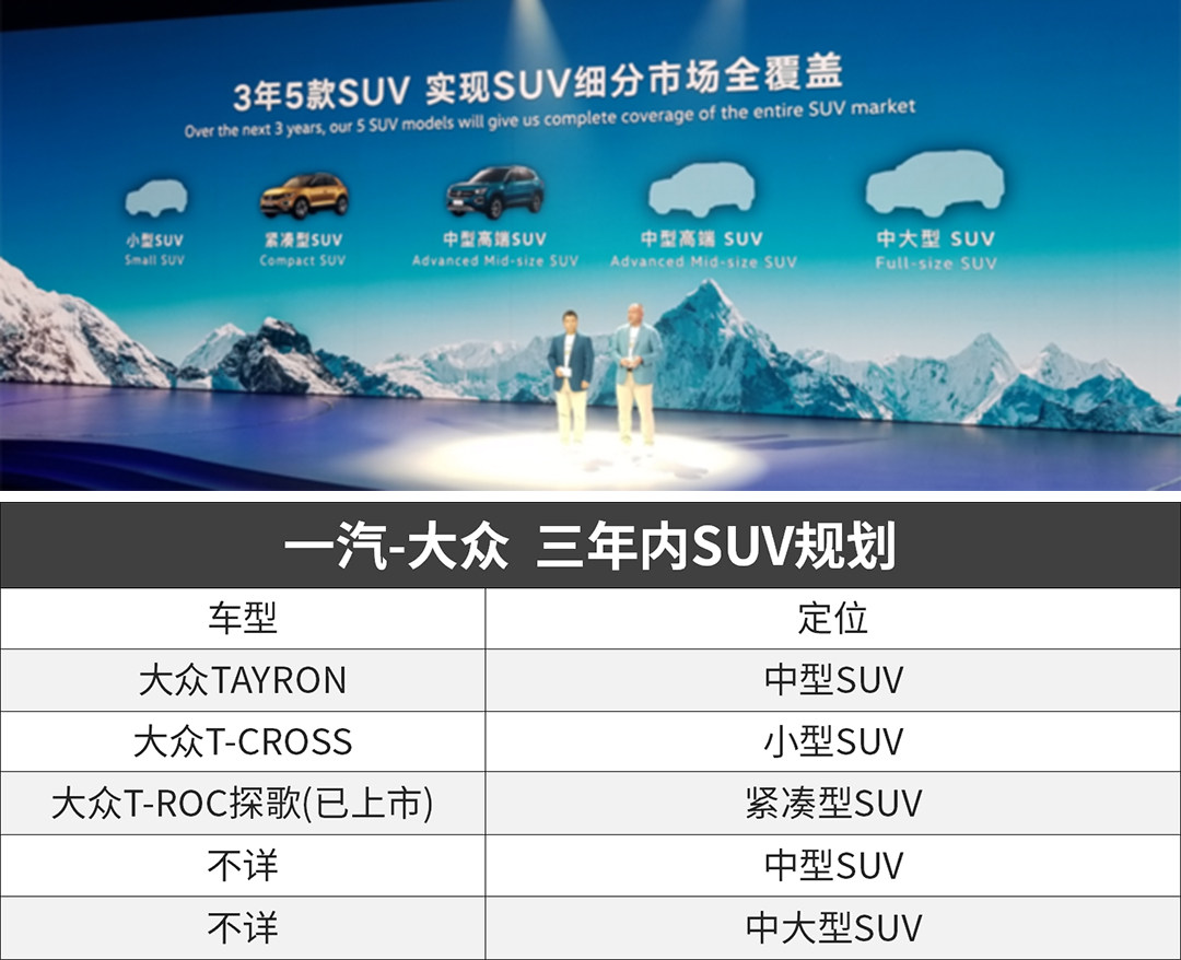 7月30日,在一汽-大众首款SUV—探歌的上市发布会现场,一汽-大众汽车有限公司副总经理赛德利公布了该品牌未来三年内SUV产品规划,其中包含TAYRON、T-Cross等五款车型。