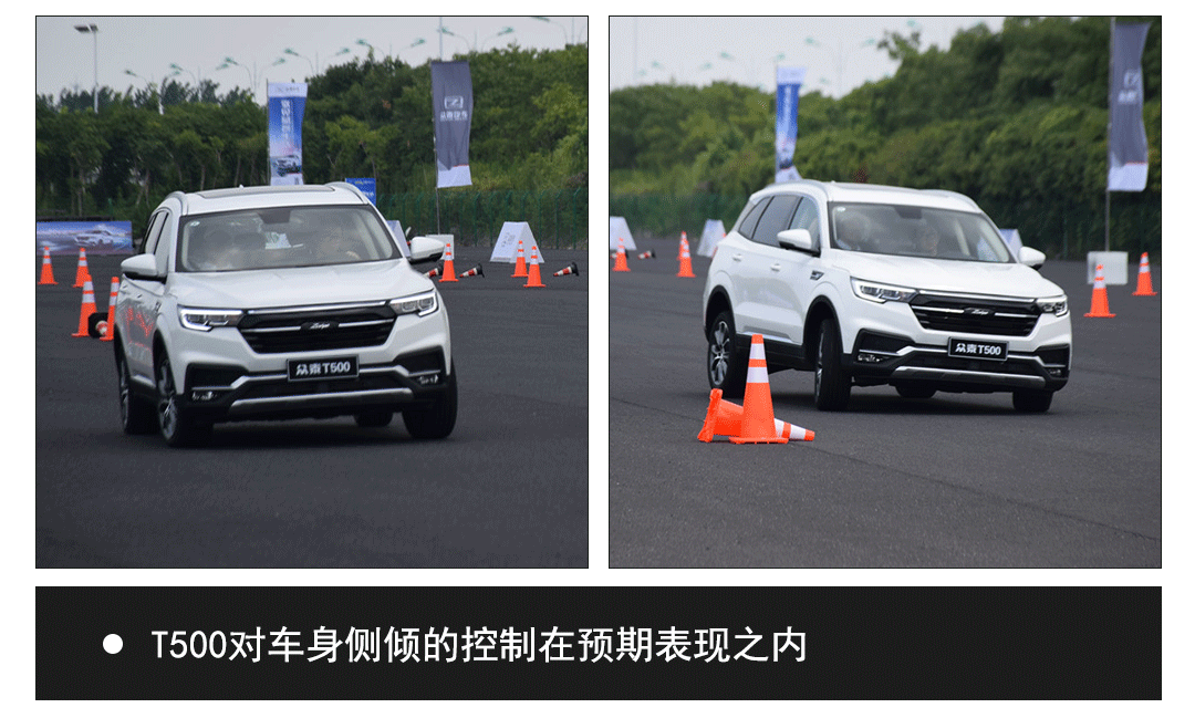 加速和刹车性能体验之后就是紧急变线和绕桩的性能体验。在紧急变线的项目中,教授以50公里时速向左猛打方向,T500虽有一定程度的侧倾和响胎,但并没有大到让人觉得想要翻车的感觉,符合此价位紧凑型SUV该有的表现。