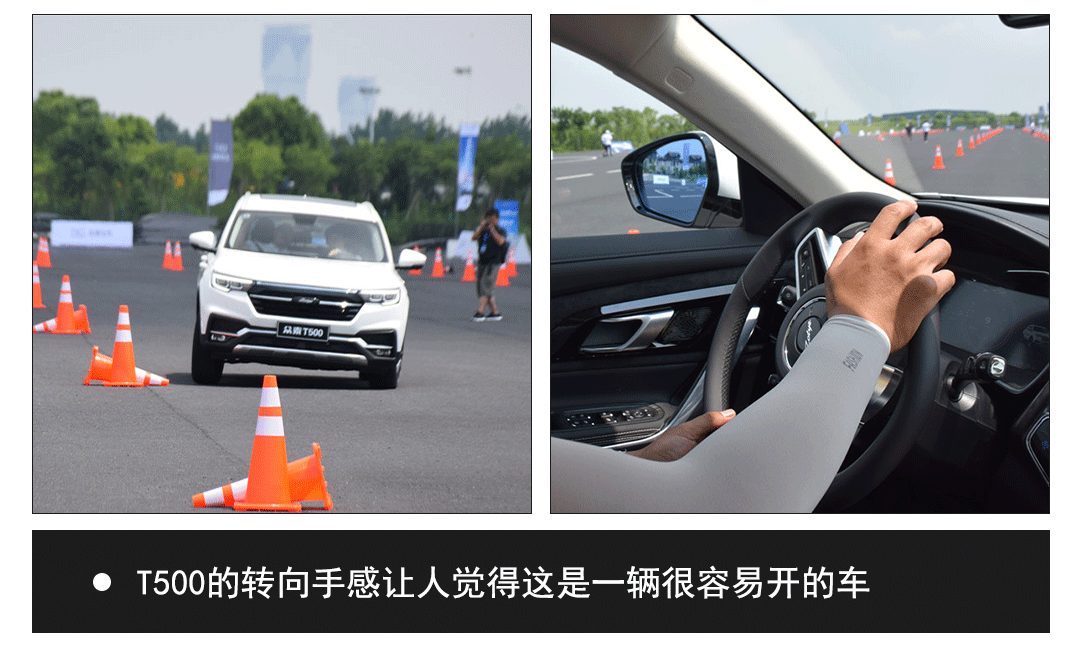 而在绕桩驾驶中,教授主要体验T500的转向和车头指向性。T500的转向力度适中,回正力矩也不算大,整体感觉比较自然,能够适应大部分驾驶者的技术水平和喜好,在市区驾驶也会比较舒服。车头指向性是自主品牌SUV中较高的水准,虽然做不到像运动型轿车那样指哪打哪,但是推头不明显,符合这个价位车型的表现和买这辆车的消费者对它的预期。
