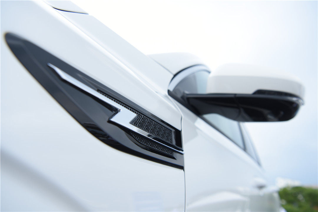 侧面腰线在C柱之后上扬收紧,让车辆看起来有一种溜背的感觉,进一步增强运动感,B、C、D柱都是喷成黑色的隐藏处理,形成半悬浮式车顶的设计,给人以高级感